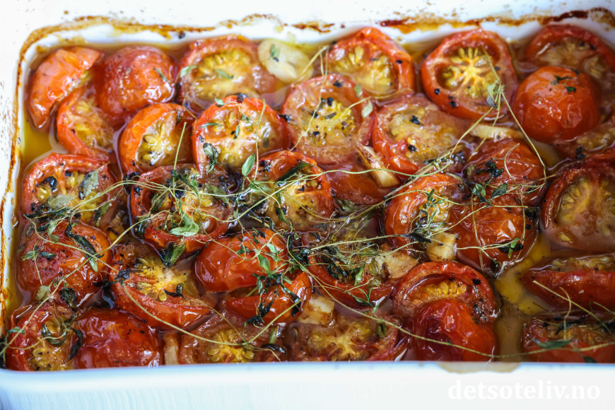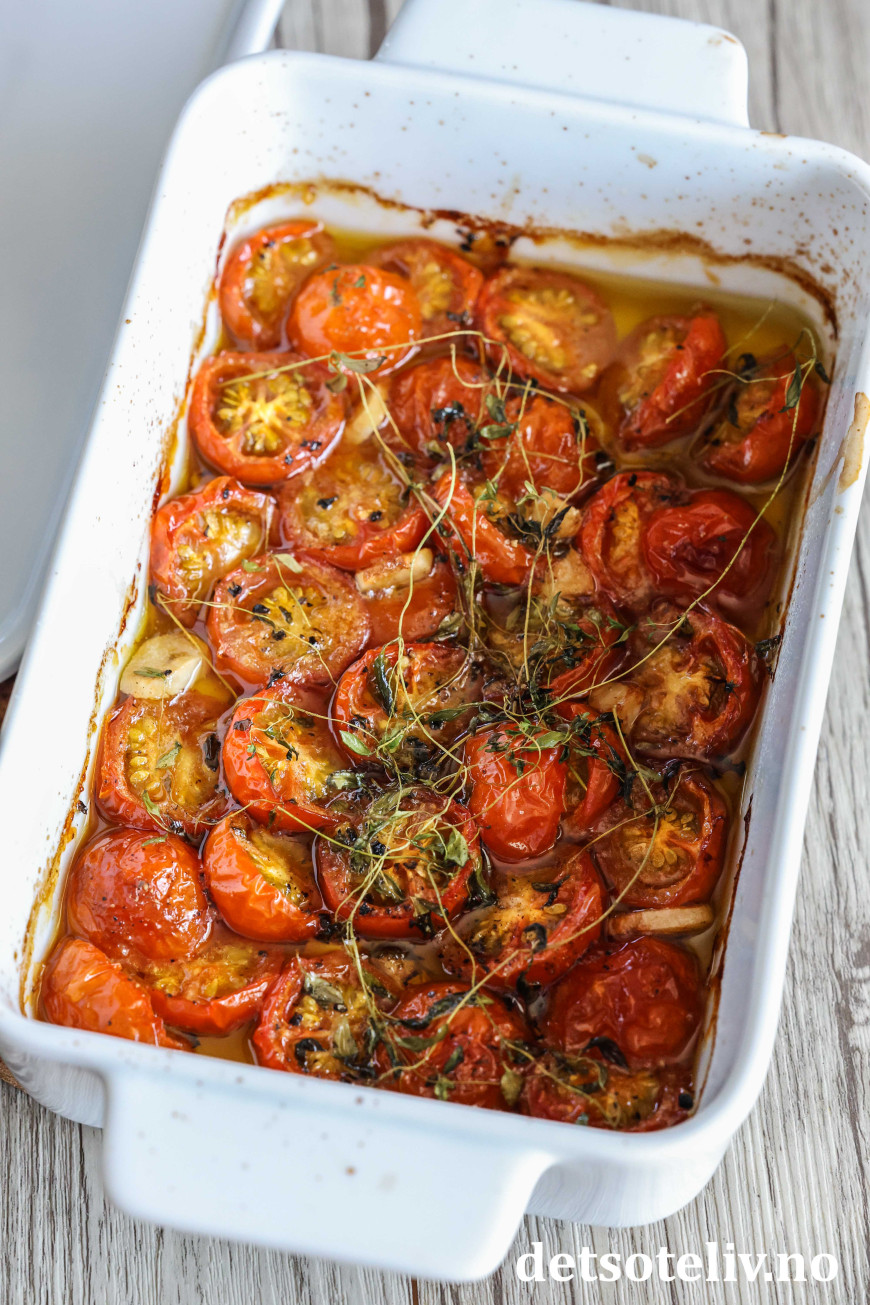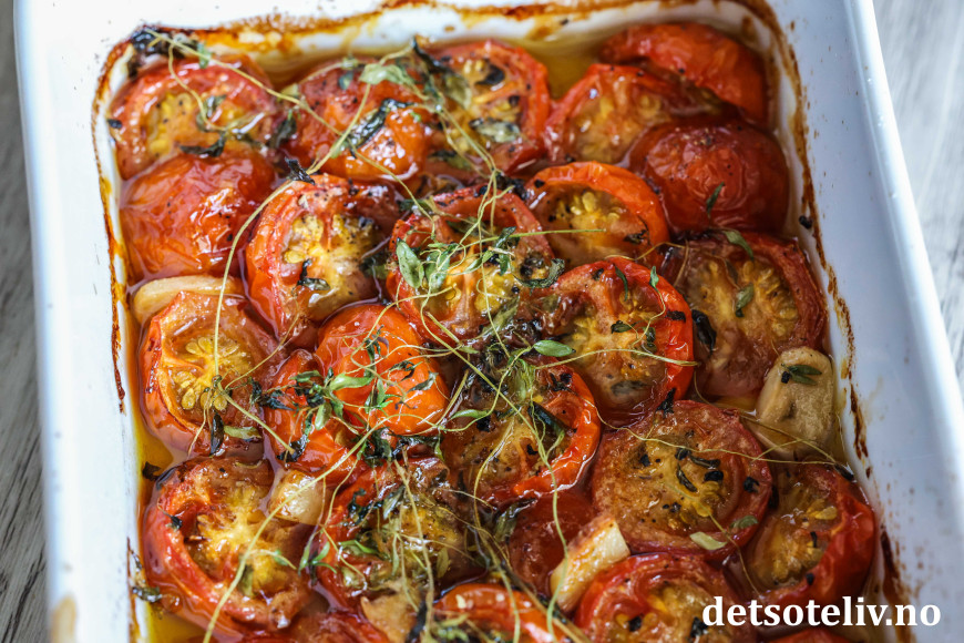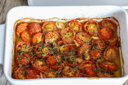Sett formen midt i ovnen ved 180°C og la tomatene ovnsbakes i oljen i ca. 30 minutter.