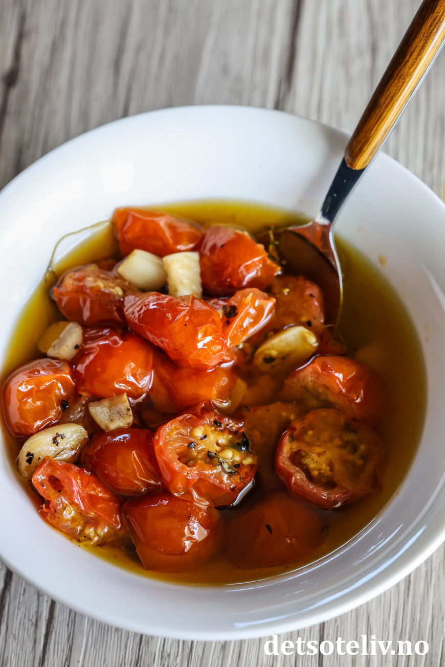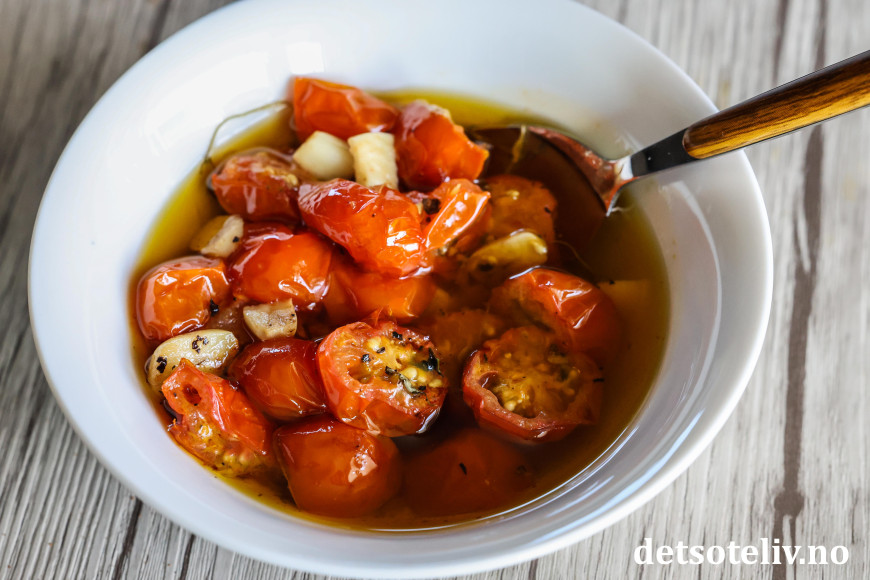 ♥ Se også Ovnsbakte cherrytomater med hvitløk (Konfiterte tomater). Der semi-tørkes tomatene først i ovnen og legges i olje etterpå. Begge varianter gir bra resultat!