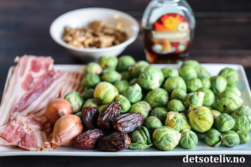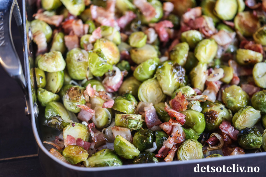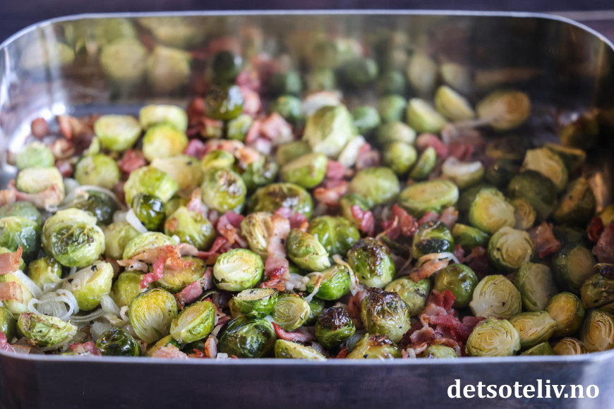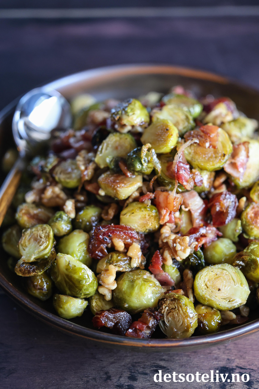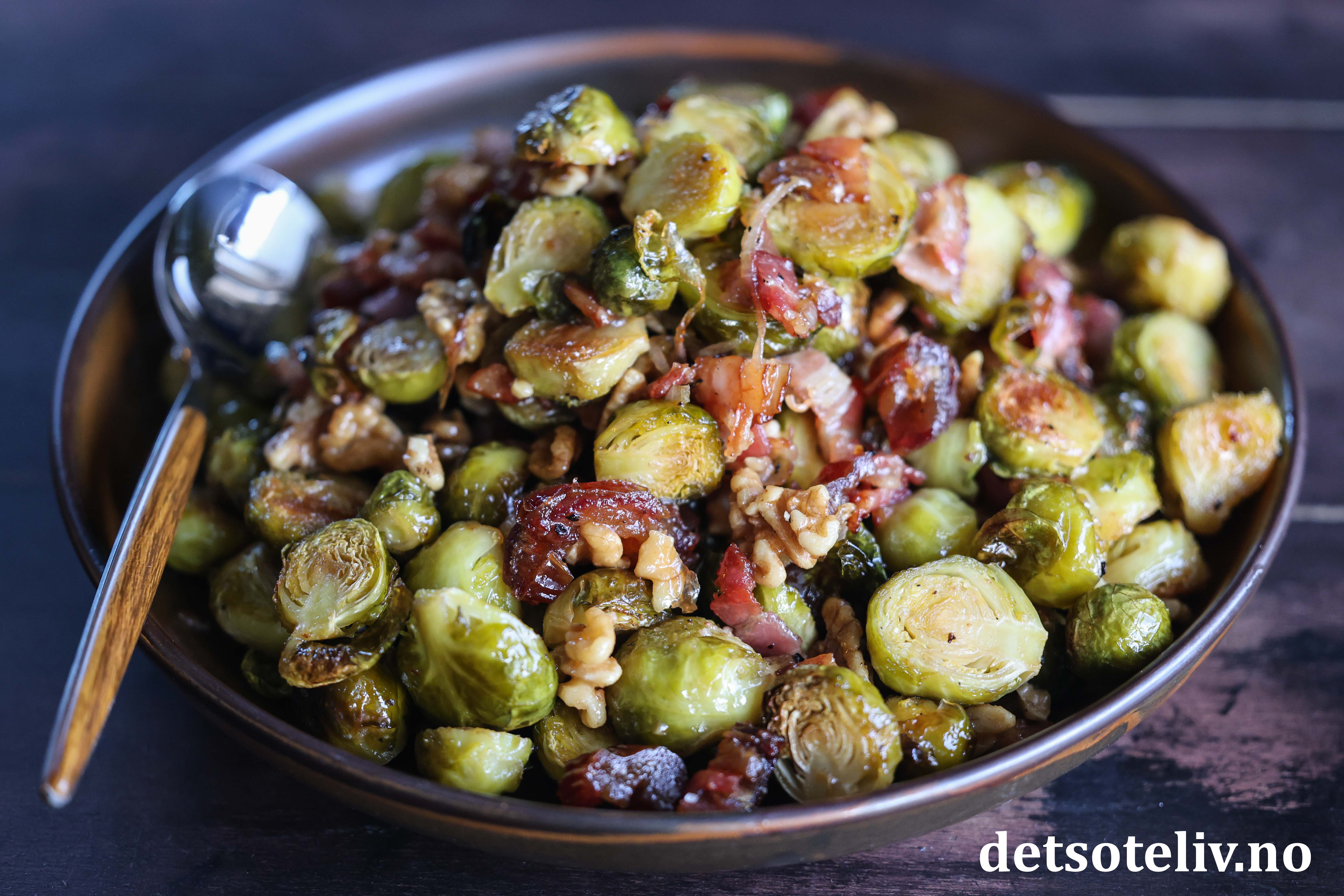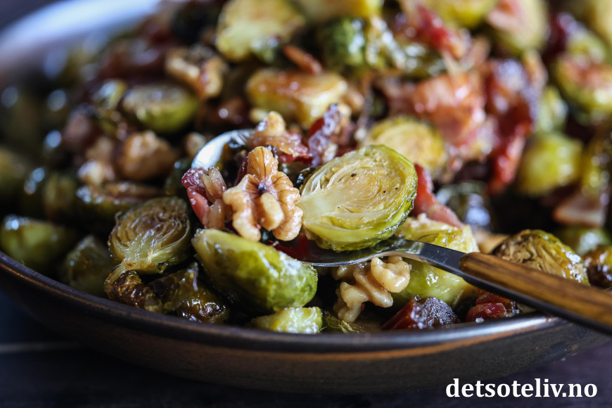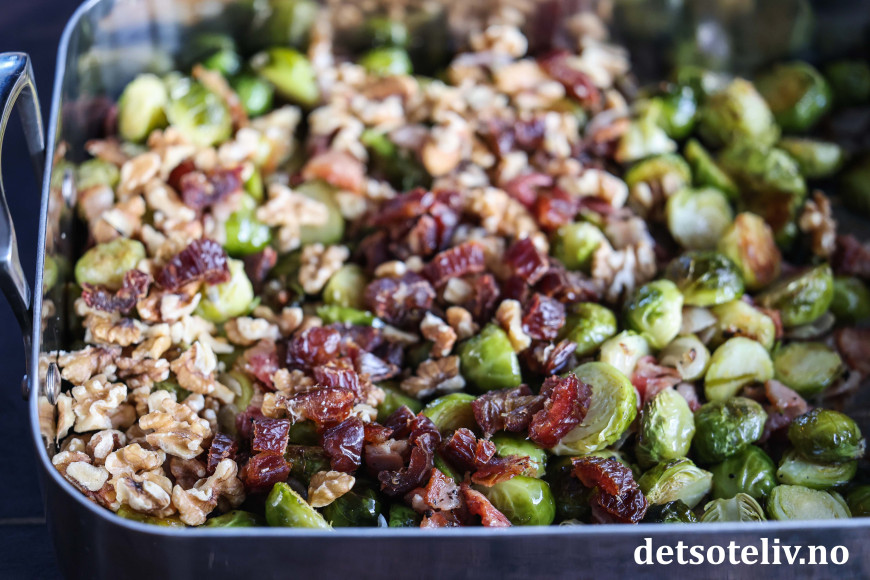 Når rosenkålen stekes i ovnen sammen med løk og bacon og så tilsettes lønnesirup, valnøtter og dadler, kan man trygt si at den har fått en real upgrade! 😃