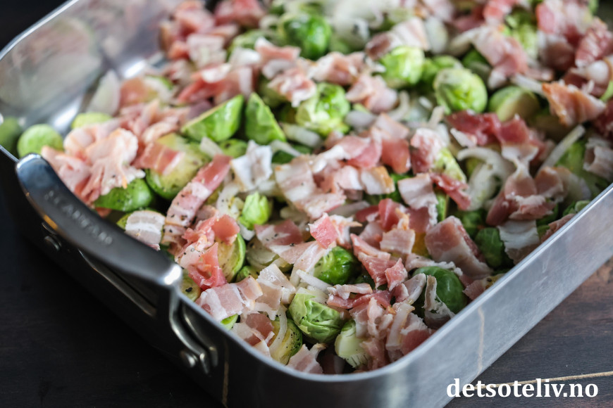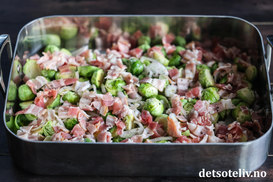 Ha rosenkål, sjalottløk og baconbiter utover i en ildfast form. Min form her måler 35 x 25 cm.