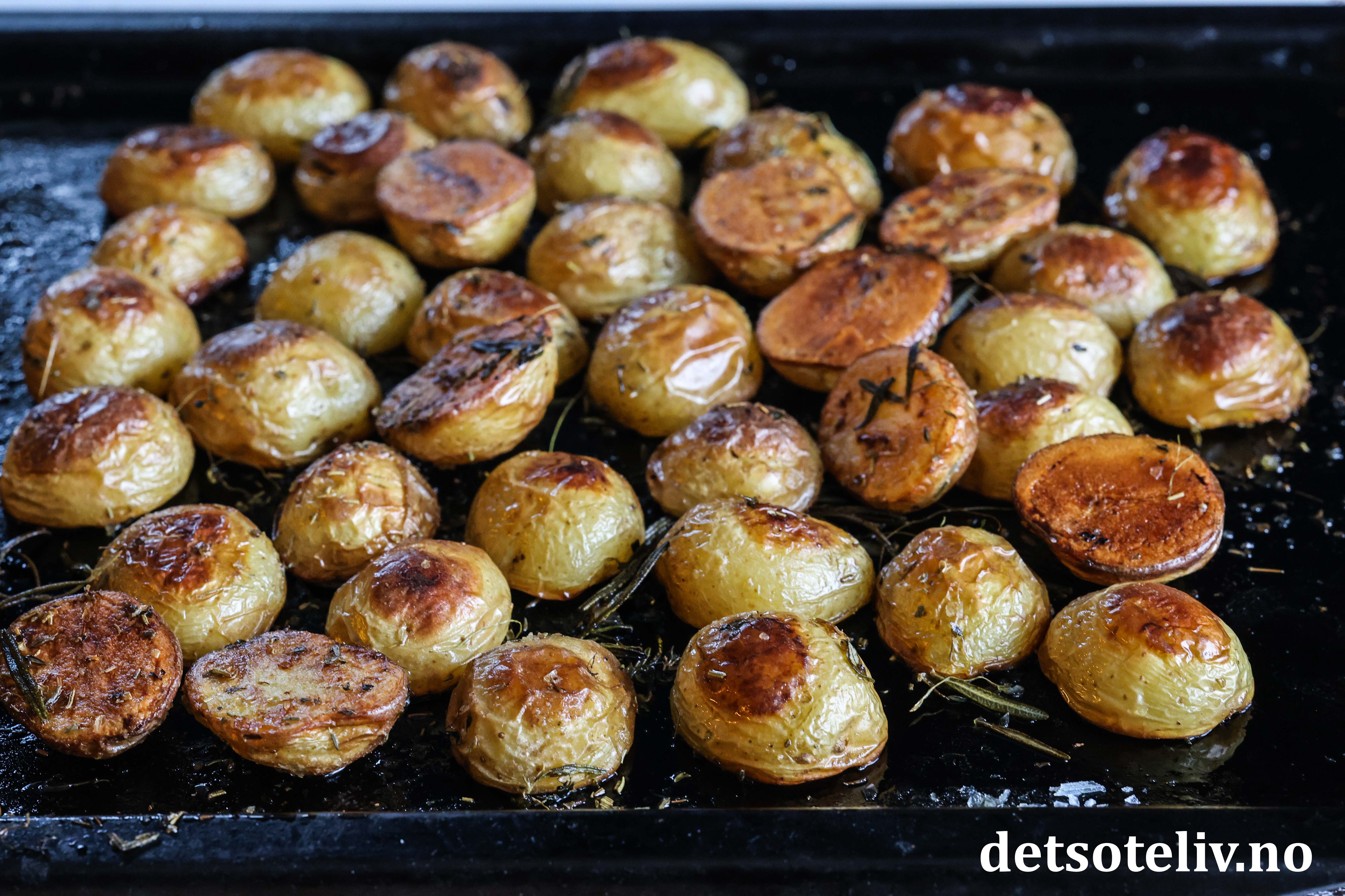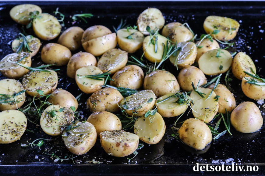 Potetene får veldig god smak av olivenolje, provencekrydder og flaksalt i tillegg til fersk rosmarin og timian.
