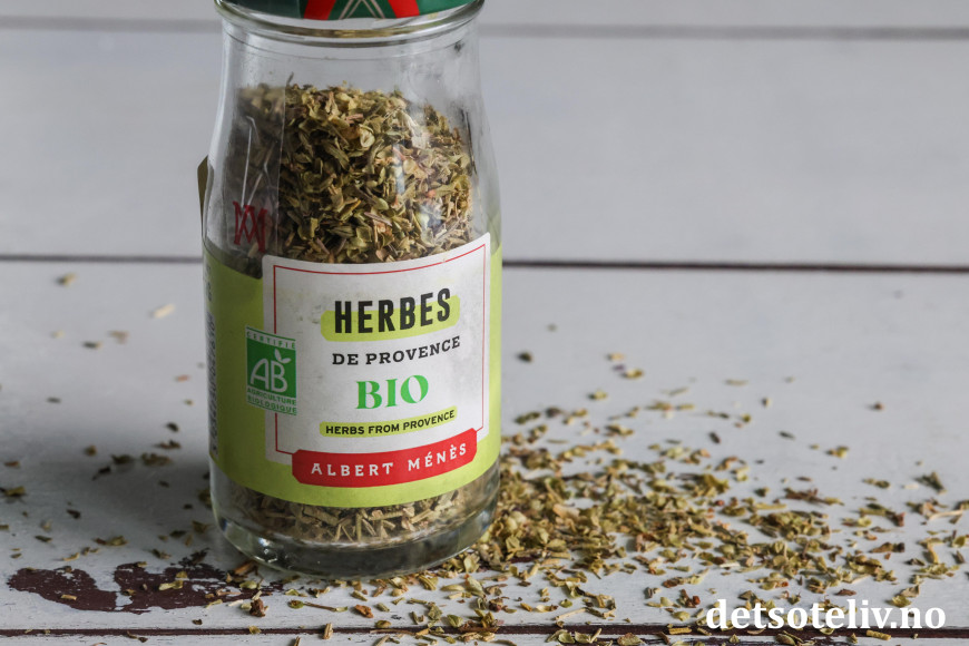 ♥ Herbes de Provence (provencekrydder) er en krydderblanding som fås kjøpt i de fleste matbutikkene. Krydderblandingen består av tørkede krydderurter som er typiske for Provence-området i Frankrike. Akkurat hvilke krydder som brukes kan variere, men ofte inngår timian, oregano, rosmarin, basilikum, merian, salvie og fennikelfrø. Har du ikke provencekrydder, kan du bruke tørket timian, oregano eller basilikum.
