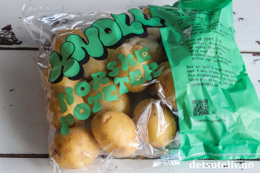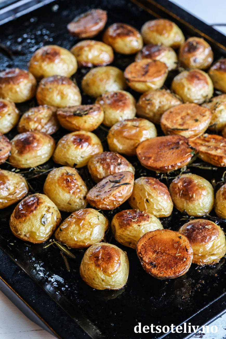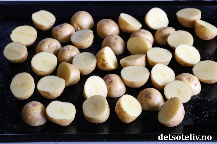 ♥ Jeg har her brukt såpass små poteter at det passet å skjære dem over på midten. Bruker du litt større poteter, kan du gjerne skjære dem i fire så du får potetbåter. Husk å justere på steketiden alt etter størrelsen på potetene. Dersom potetene er veldig små, kan steketiden reduseres.