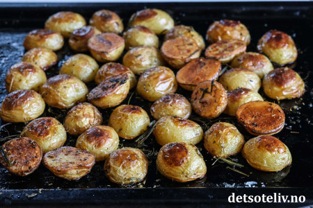Stek potetene midt i ovnen ved 220°C i ca. 40 minutter. Vend om på potetene i løpet av steketiden så de får jevn farge.