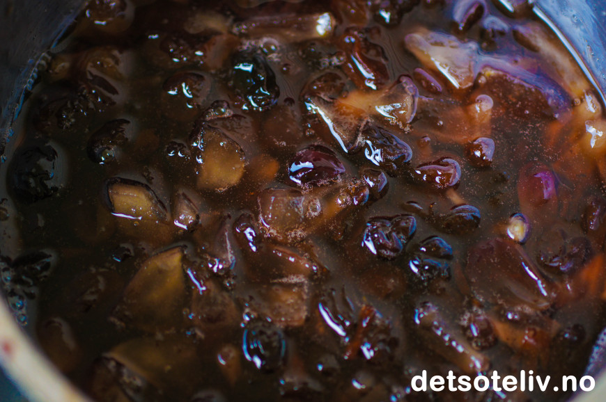Ha pærebiter og halve druer i en kjele sammen med rosiner, hvitt og brunt sukker, sitronsaften og druejuicen. Ha også kanelstangen i kjelen.