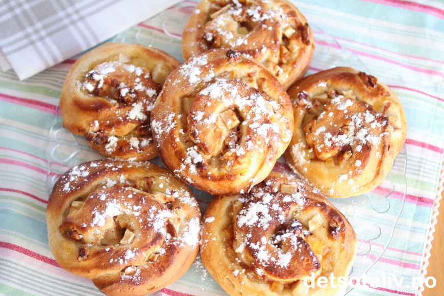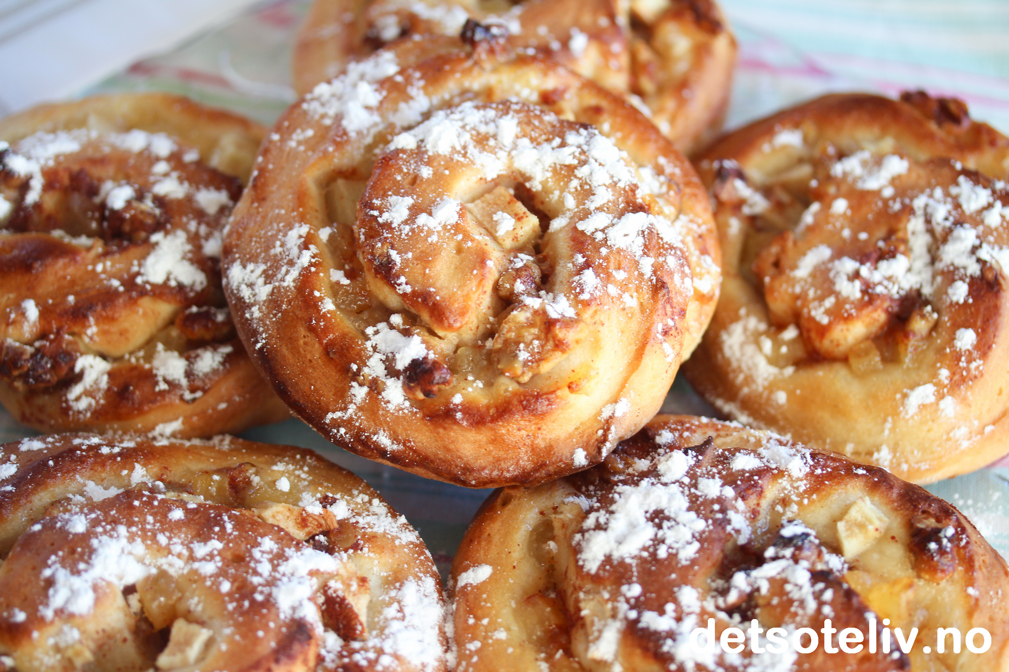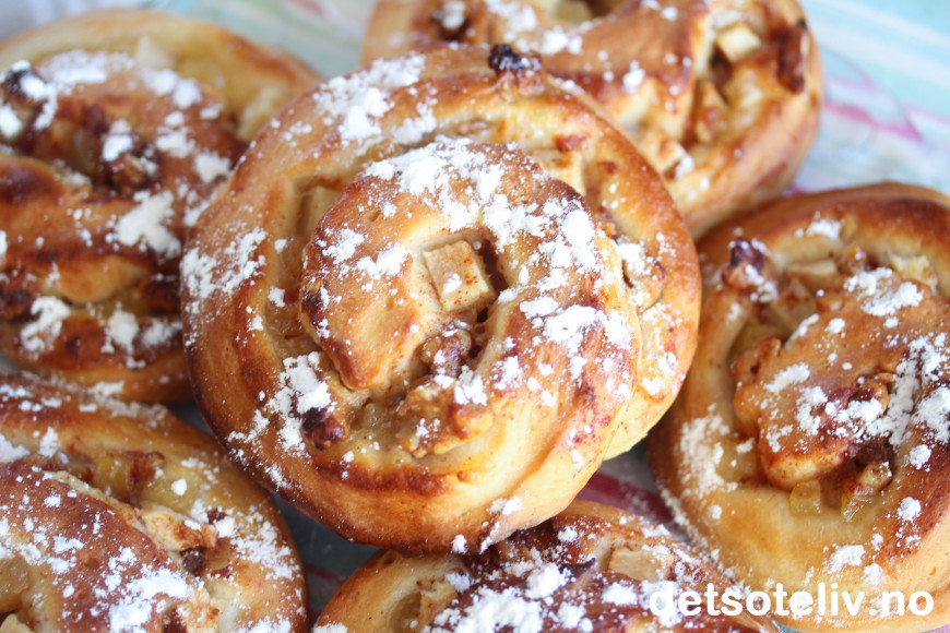 Dette er nydelige hvetesnurrer - denne gangen fylt med pæresyltetøy, pærebiter, vaniljesukker og valnøtter. For å gi bollene ekstra deilig vaniljesmak, drysser jeg godt med vaniljesukker på toppen av snurrene.