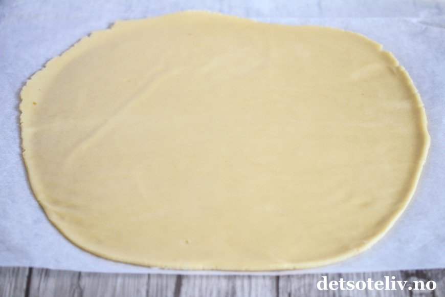 Kjevle ut deigen på et stykke bakepapir til en sirkel som er ca. 26 cm i diameter. Det er ikke så viktig at formen blir helt rund. Flytt bakepapiret med deigsirkelen over på en stekeplate.