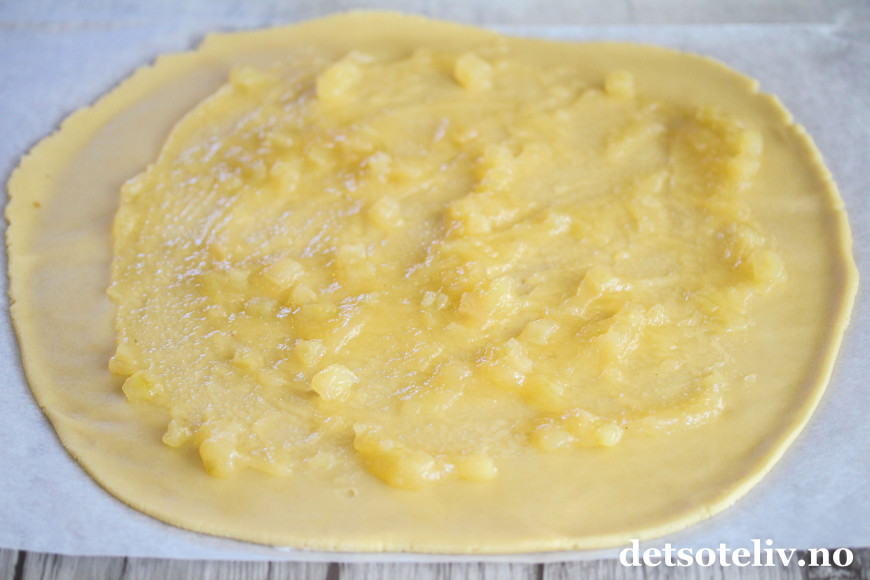 Smør syltetøy på deigen (jeg har brukt eplesyltetøy med biter), men la de ytterste 4 cm langsmed kanten være uten syltetøy.