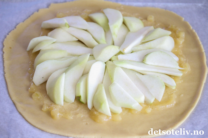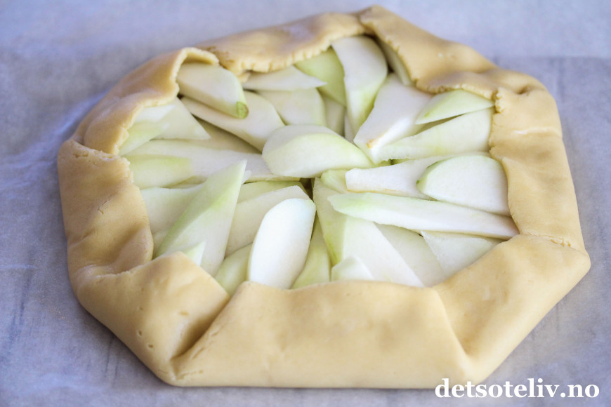 Skrell og rens pærene og del dem i skiver som legges oppå syltetøyet. Brett deigkanten innover mot fyllet.