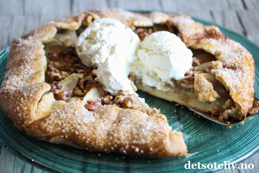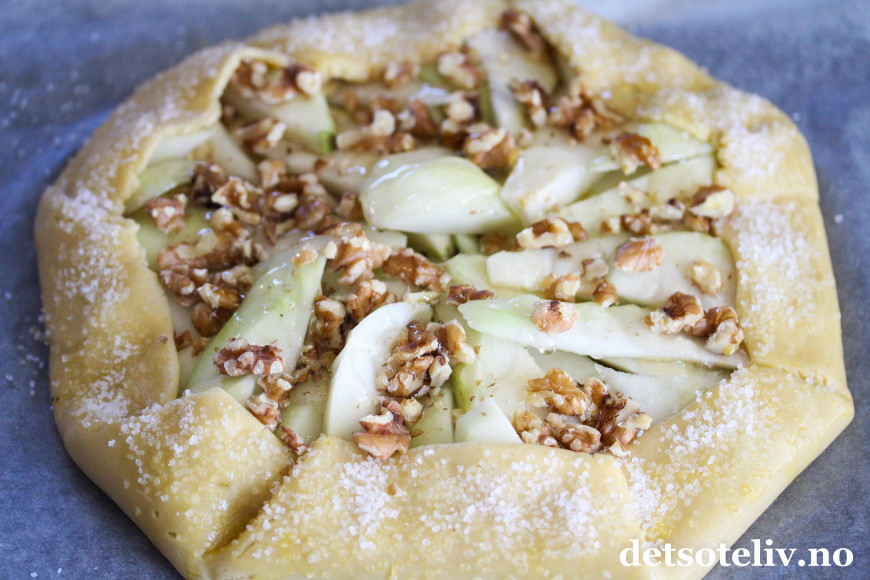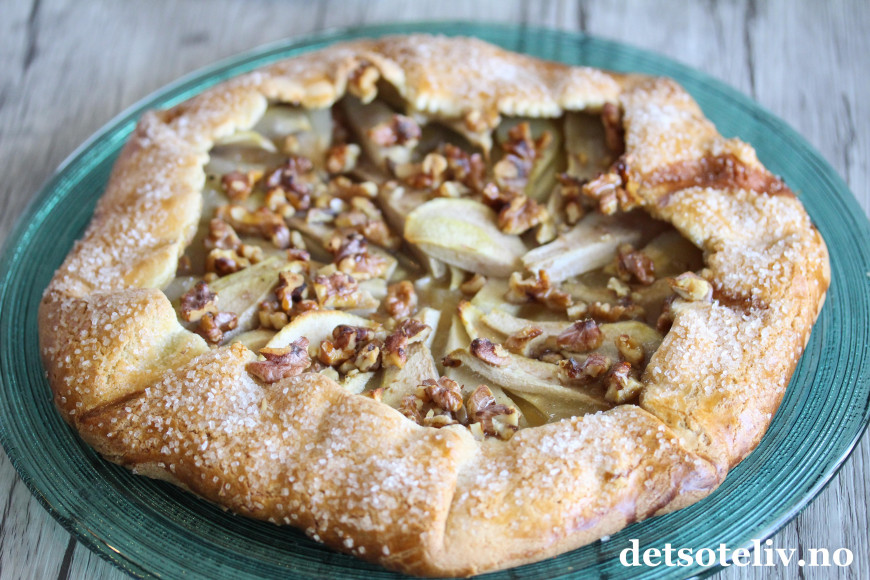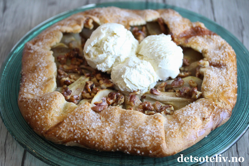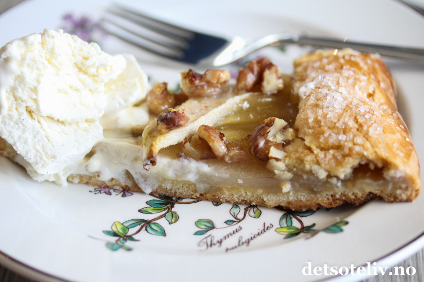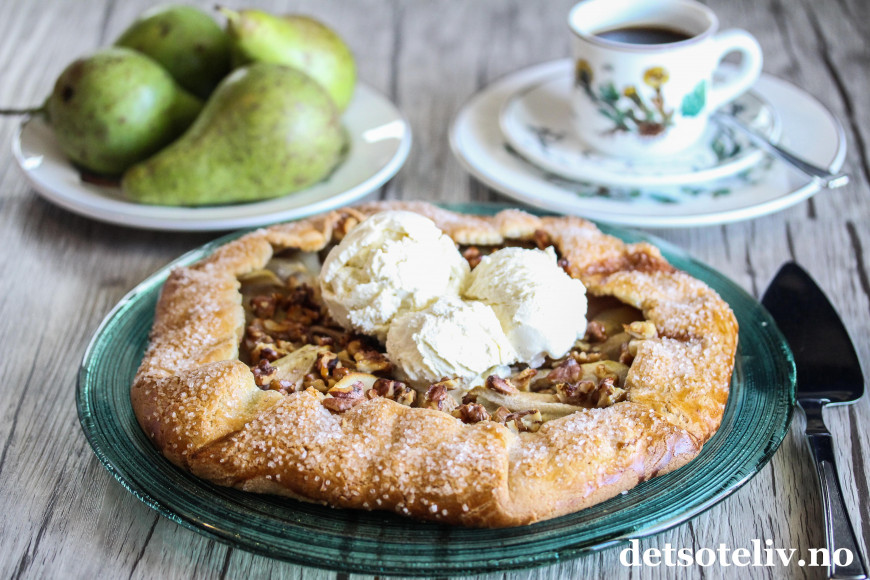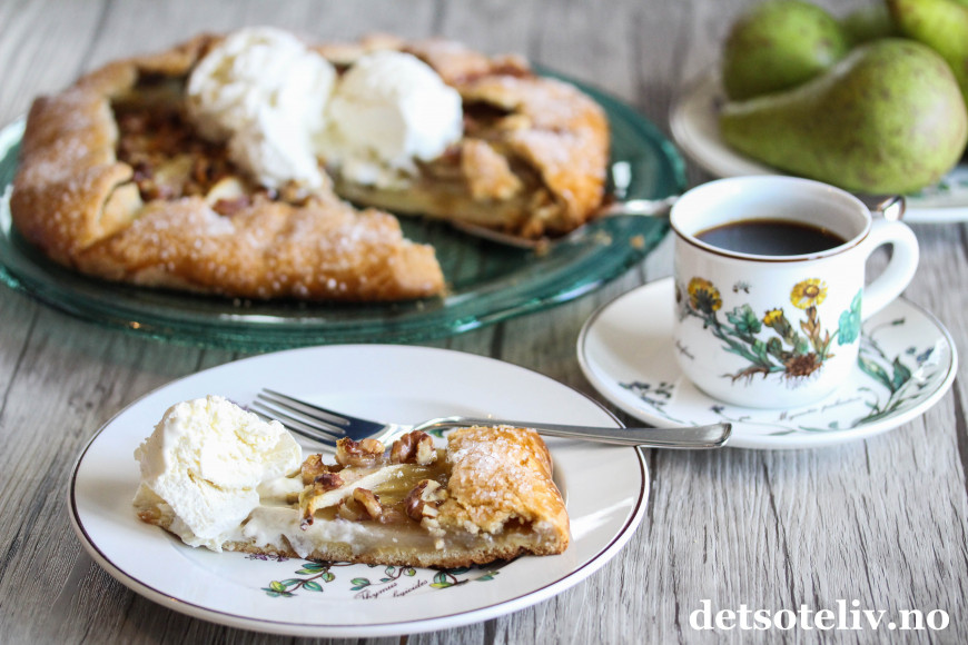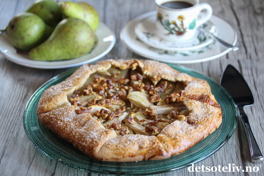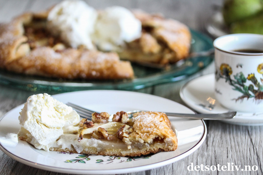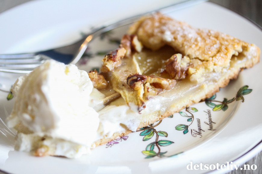 Søt, varm mørdeigsterte med bakte pærer, honning og valnøtter - mmmmmm!