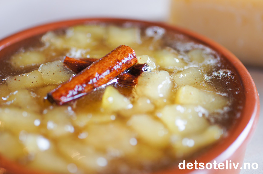 Varm opp blandingen og rør litt av og til. Småkok i 5-10 minutter. Etter hvert vil pærene avgi væske, så det er ikke sikkert at du trenger å spe med noe vann. Hvis du imidlertid merker at det blir tørt i kjelen, må du spe med litt ekstra vann. Men ikke for mye vann, for det er meningen at pærene skal bli lett karamelliserte.