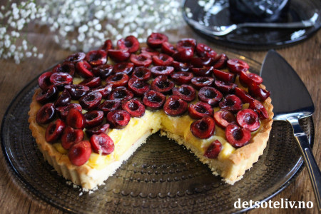 Dette er en nydelig dessertpai fylt med vaniljekrem og moreller.