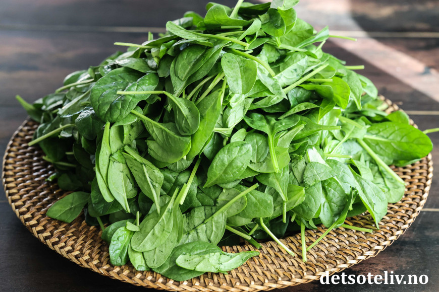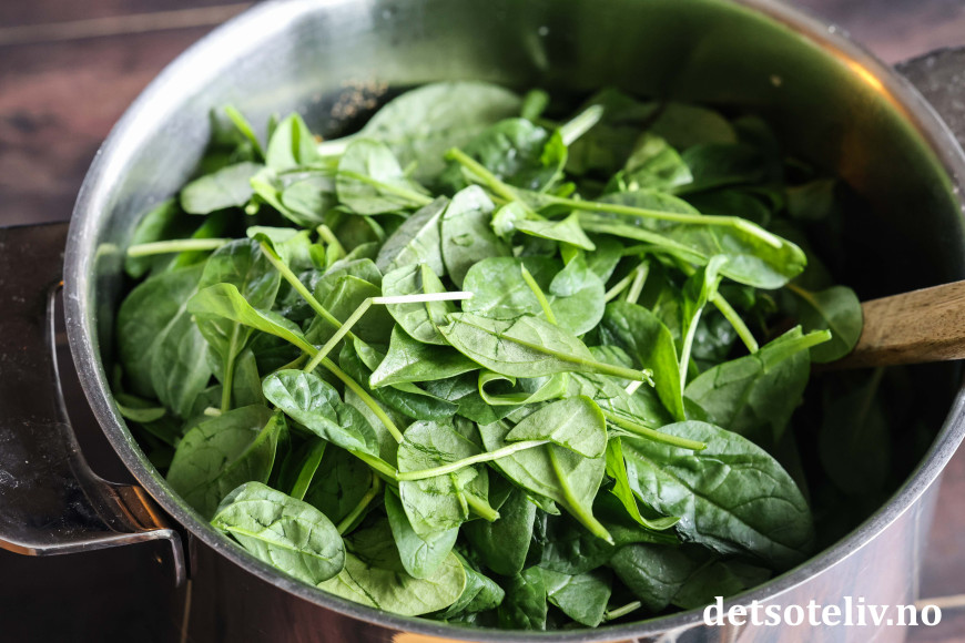 Ha så spinatbladene i kjelen. De vil fylle opp kjelen i starten, men "klapper sammen" etter hvert som de varmes opp.