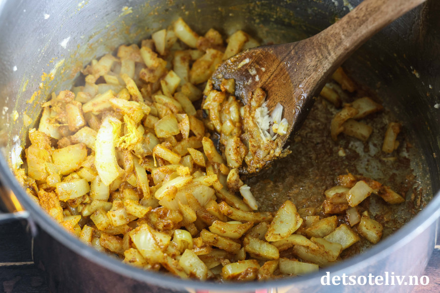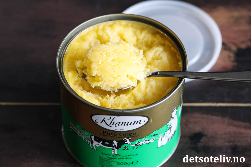 ♥ Det er vanlig å bruke ghee i indisk matlaging, som er klarnet smør. Klarnet smør betyr at melkestoffene i smøret er fjernet, hvilket gjør at smøret tåler bedre steking med høy temperatur. Ghee (klarnet smør) kan lages selv, og fås kjøpt ferdig i internasjonale matbutikker. Har du ikke ghee, går det helt fint å bruke vanlig meierismør i denne retten.