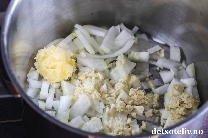 Ha olje og smør i en stor kjele (kjelen må være stor nok til at du får plass til spinaten). Hakk løk og hvitløk og ha i kjelen. Tilsett ferskrevet ingefær. Stek dette i et par minutter på middels varme.