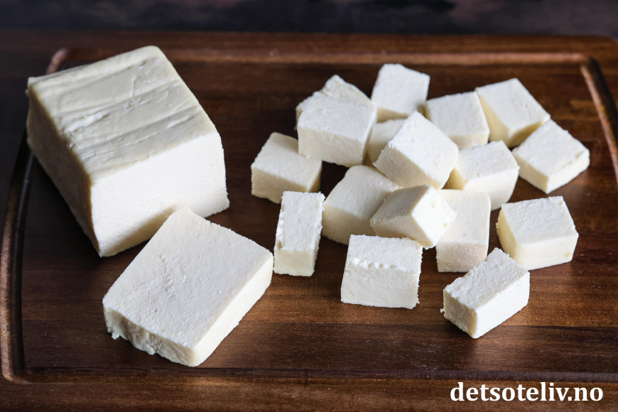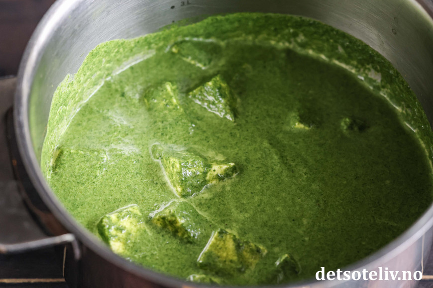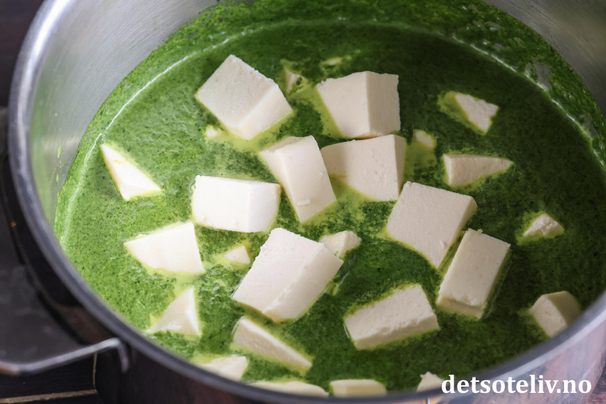 Skjær paneer i firkanter. Ha ostebitene deretter i spinatsausen (du kan eventuelt steke dem litt først, men jeg pleier ikke å gjøre det, se tips).