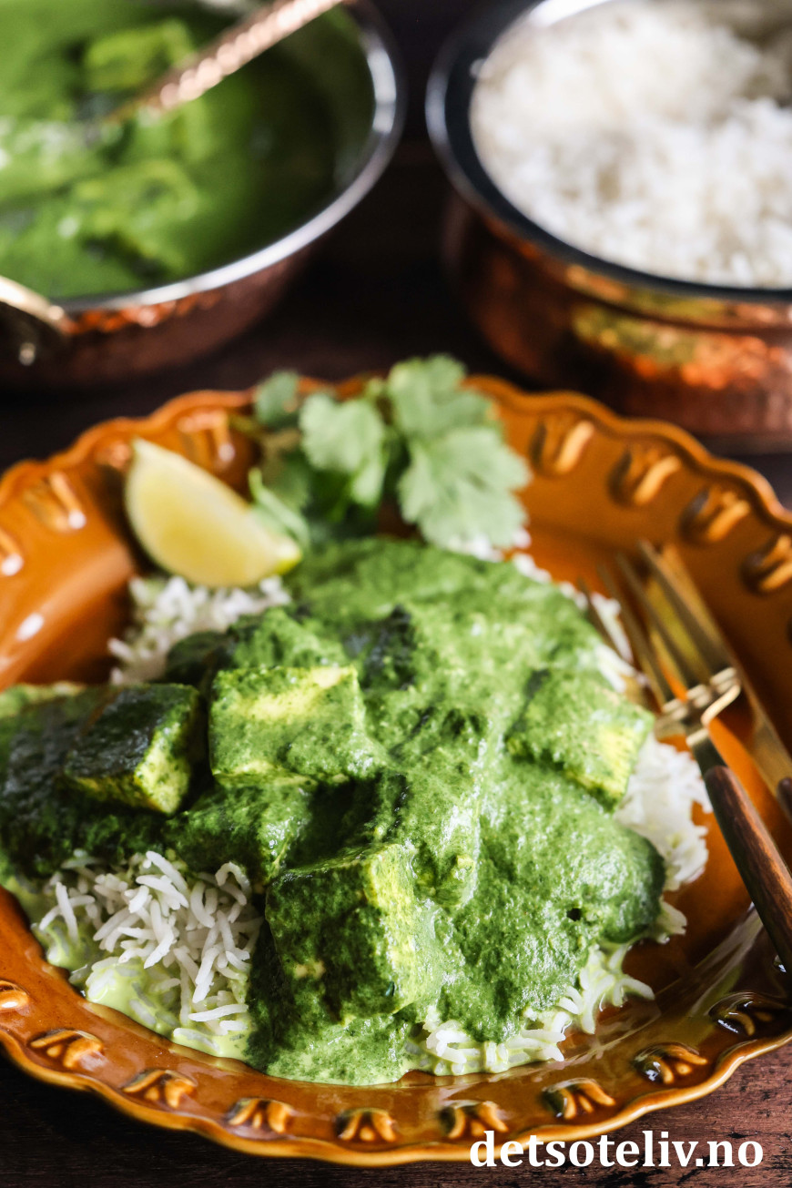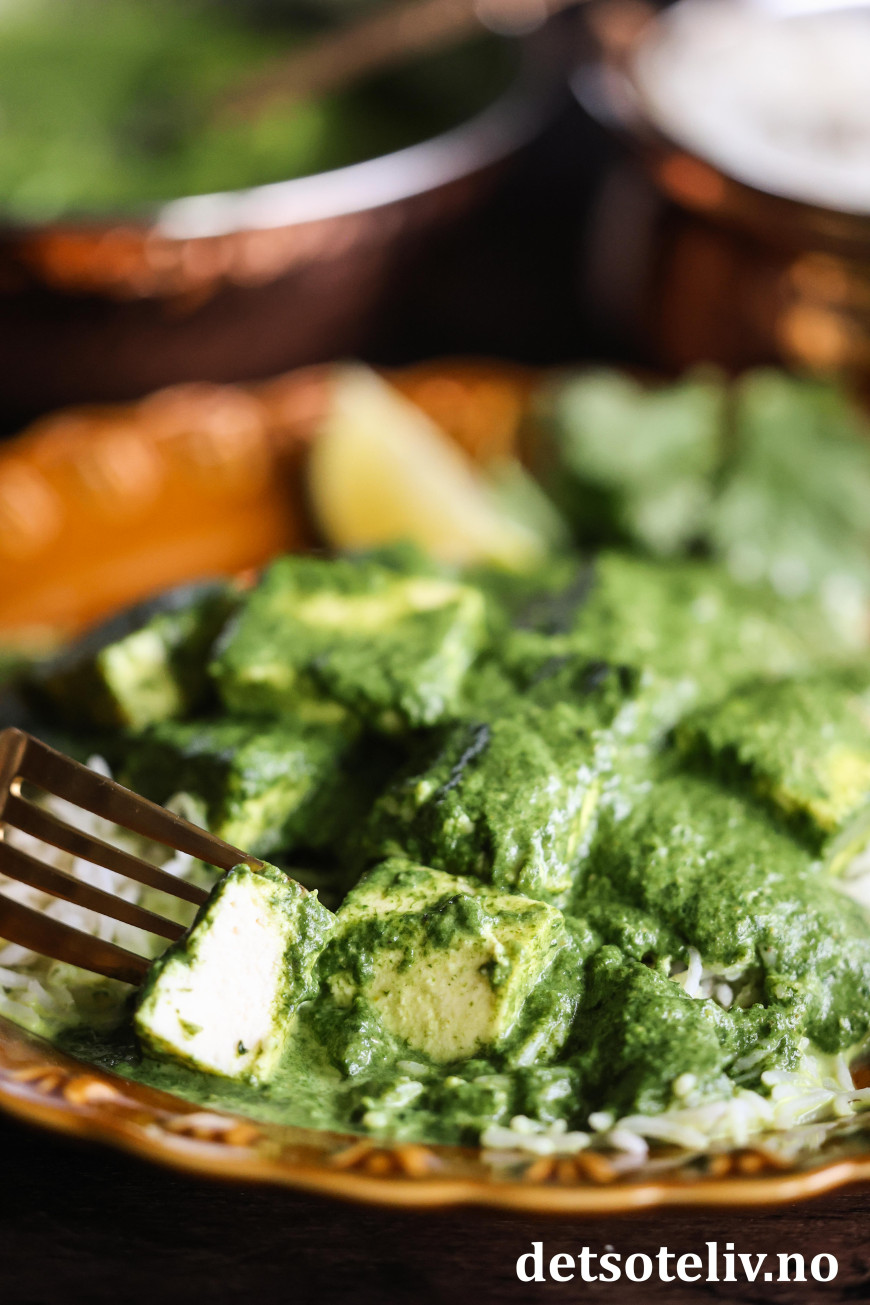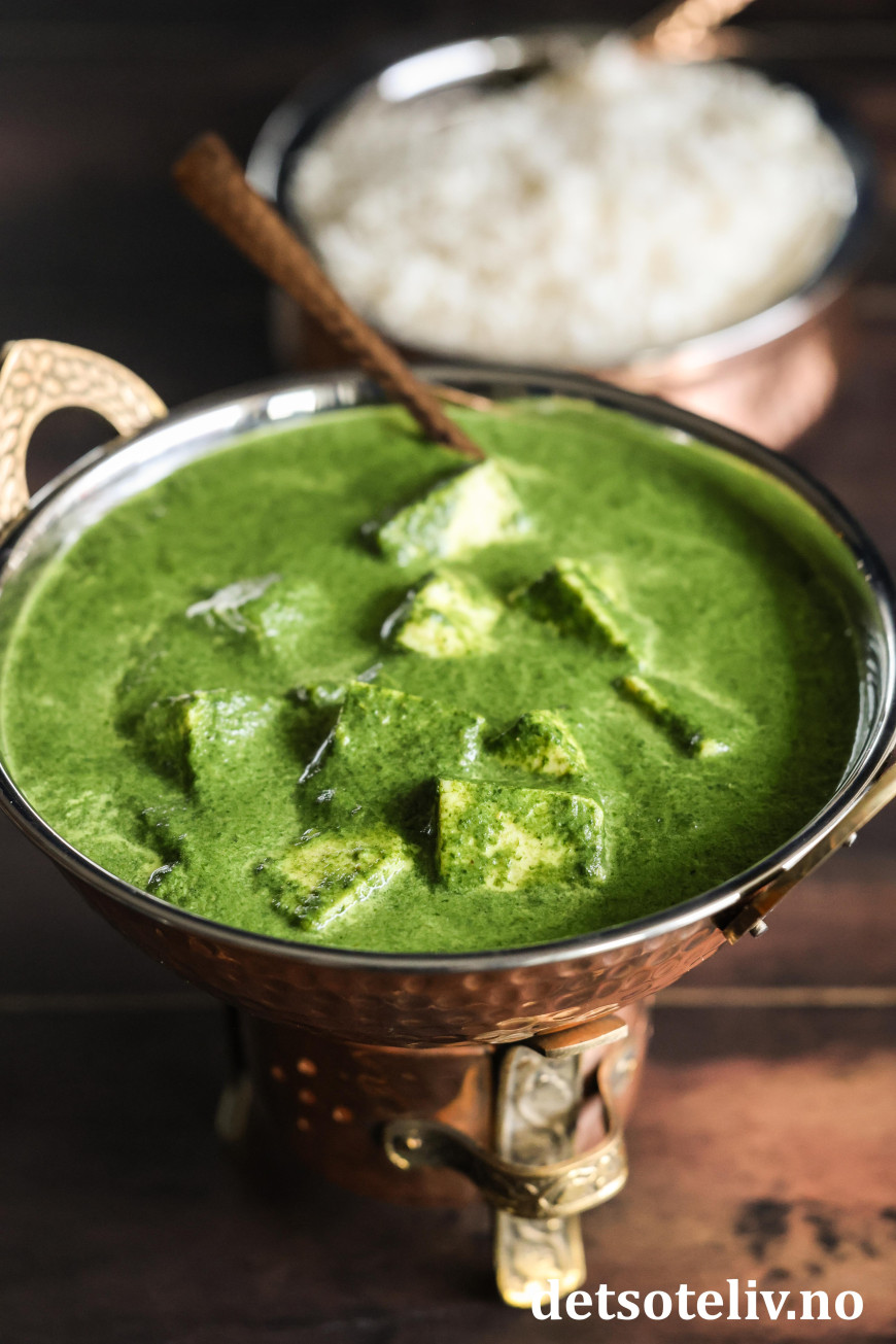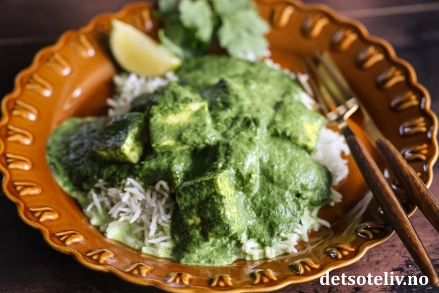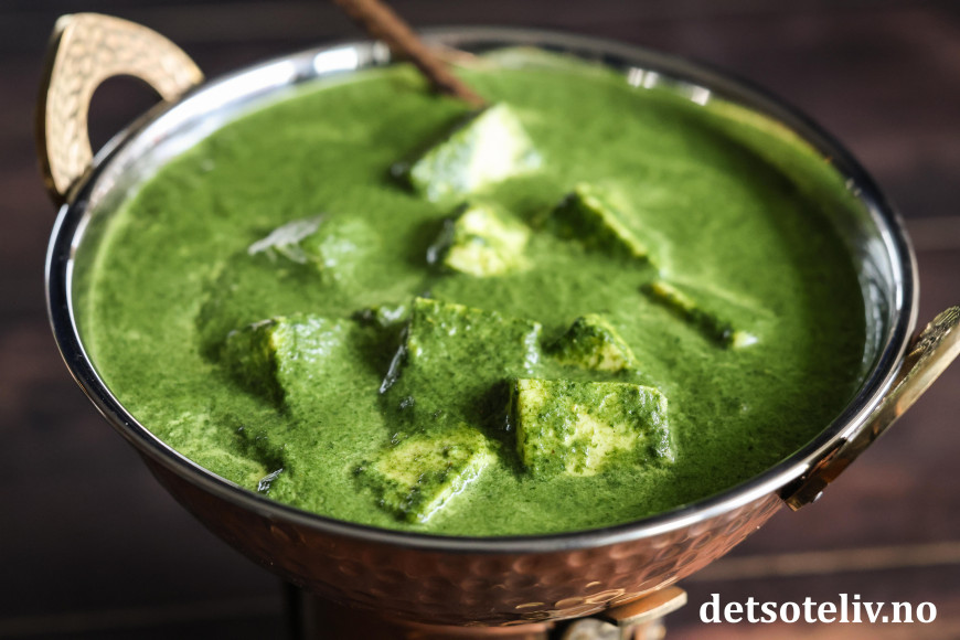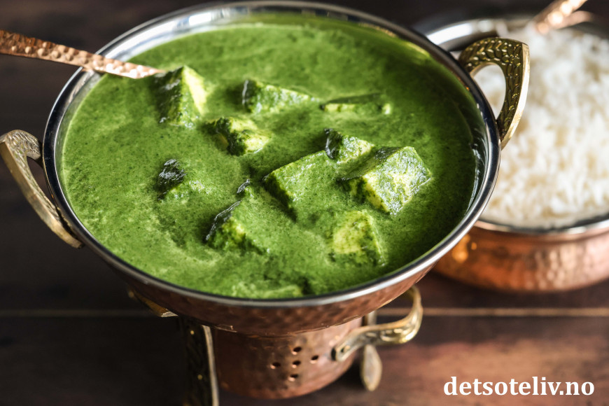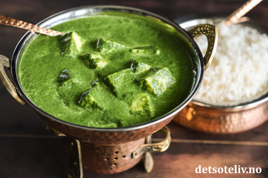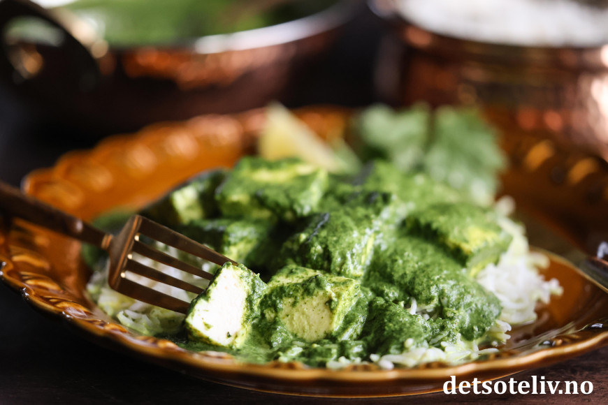 Moren min var indisk, og jeg har fått servert veldig mye god, indisk mat gjennom oppveksten. En personlig favoritt er Palak Paneer, som består av en indisk ferskost (paneer) i en smakfull spinatsaus (palak betyr spinat på hindi). Jeg bruker store mengder fersk spinat i sausen i tillegg til smør (helst ghee, som er klarnet smør), kremfløte, løk og deilig krydder.