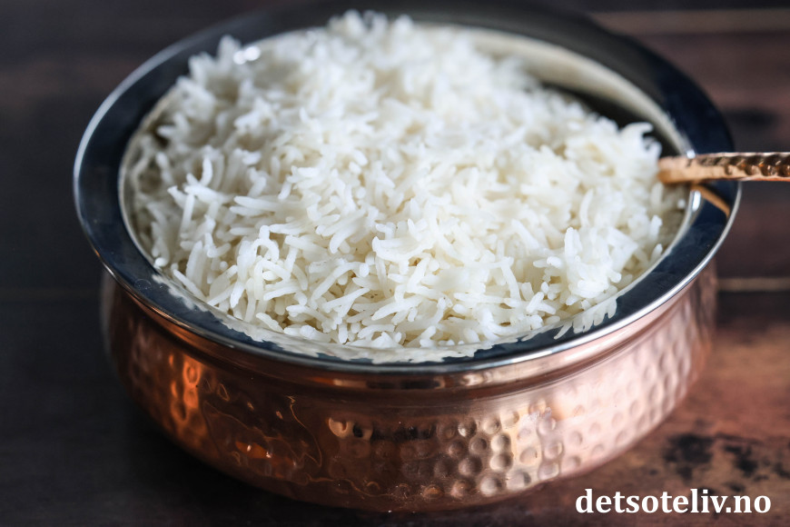 ♥ Indisk basmatisris kokes som anvist på pakningen. Jeg liker å koke risen med litt salt og et par spiseskjeer rapsolje i kokevannet. Du kan alternativt salte risen og vende i litt rapsolje etter at risen er ferdigkokt.