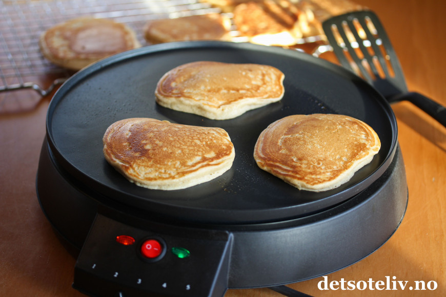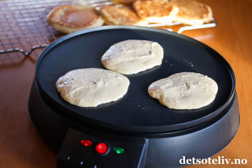 Ikke bruk for høy temperatur, og la pannekakene steke et par minutter på hver side.