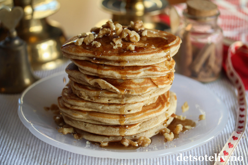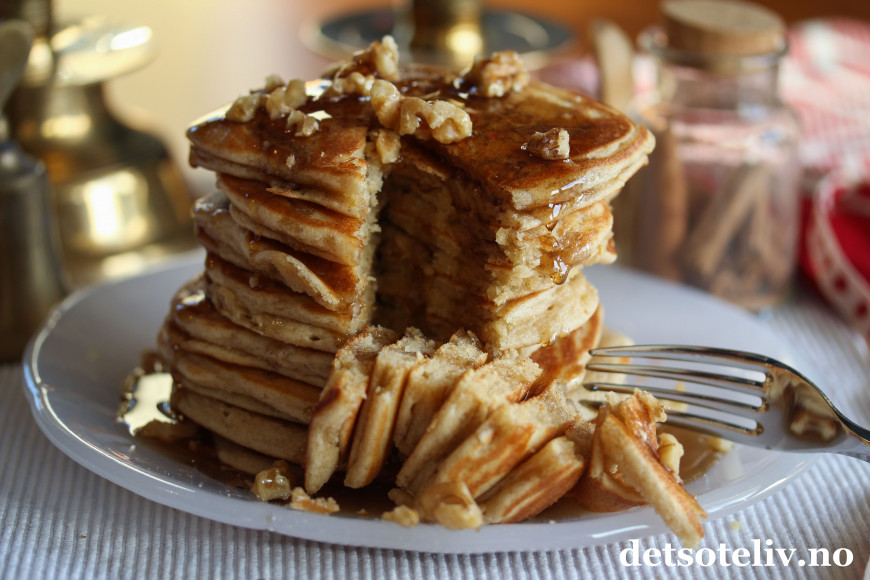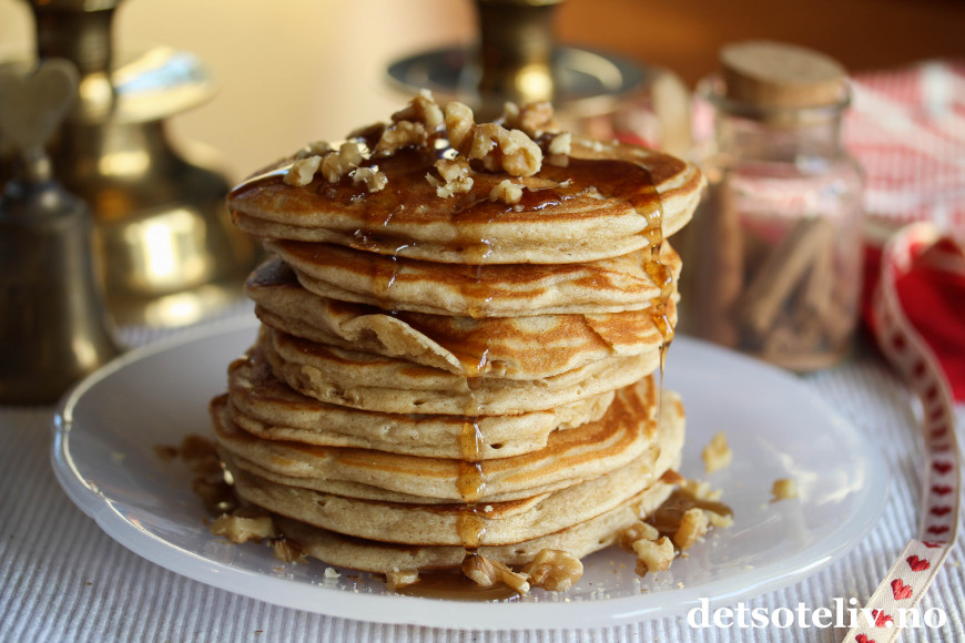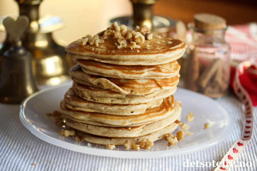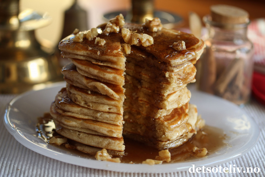 Server pannekakene nystekte og i en høy stabel. Dryss over valnøtter.