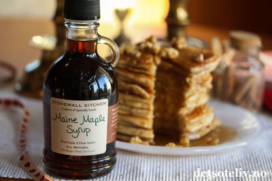 ♥ Ekte, amerikansk lønnesirup (Maine Maple Syrup) fra Stonewall Kitchen smaker fantastisk godt til disse pepperkakekrydrede pannekakene. Lønnesirupen fås blant annet kjøpt i butikkene til Meny.