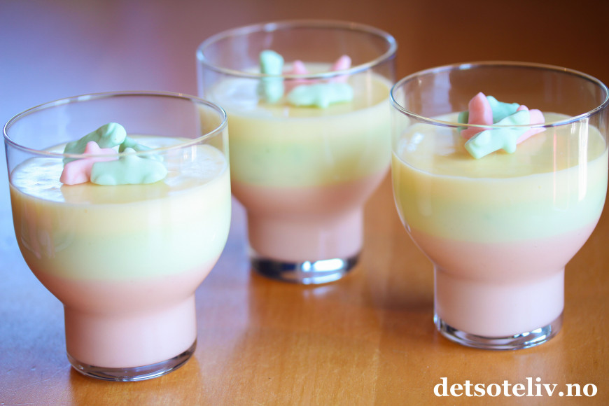 ♥ Jeg ser ingen grunn til å legge skjul på at det er en litt syntetisk godterismak på denne panna cottaen. Det er heller ikke verdt å lage porsjonene for store, for dette er nokså søte og mektige saker. Likevel er dette en dessert som særlig barn synes er stor stas å få servert!