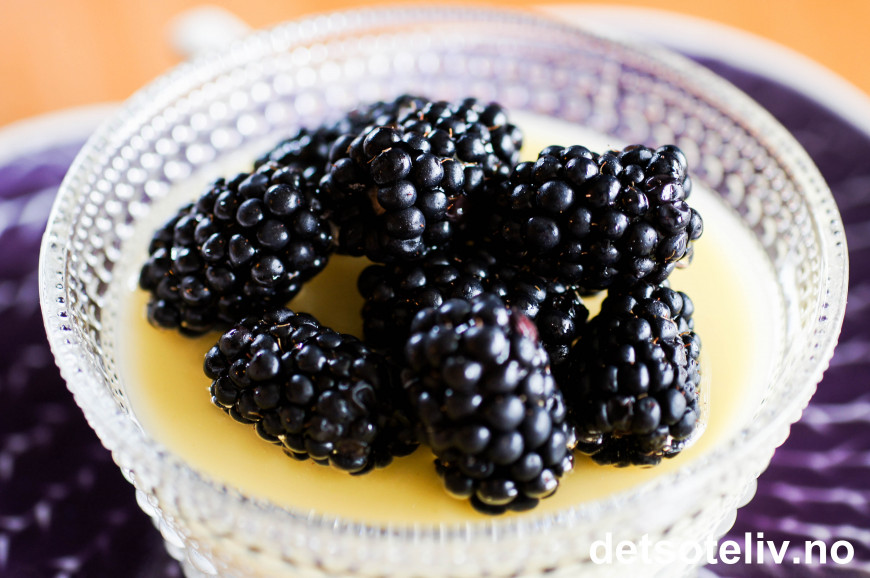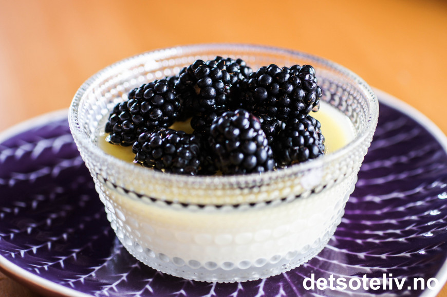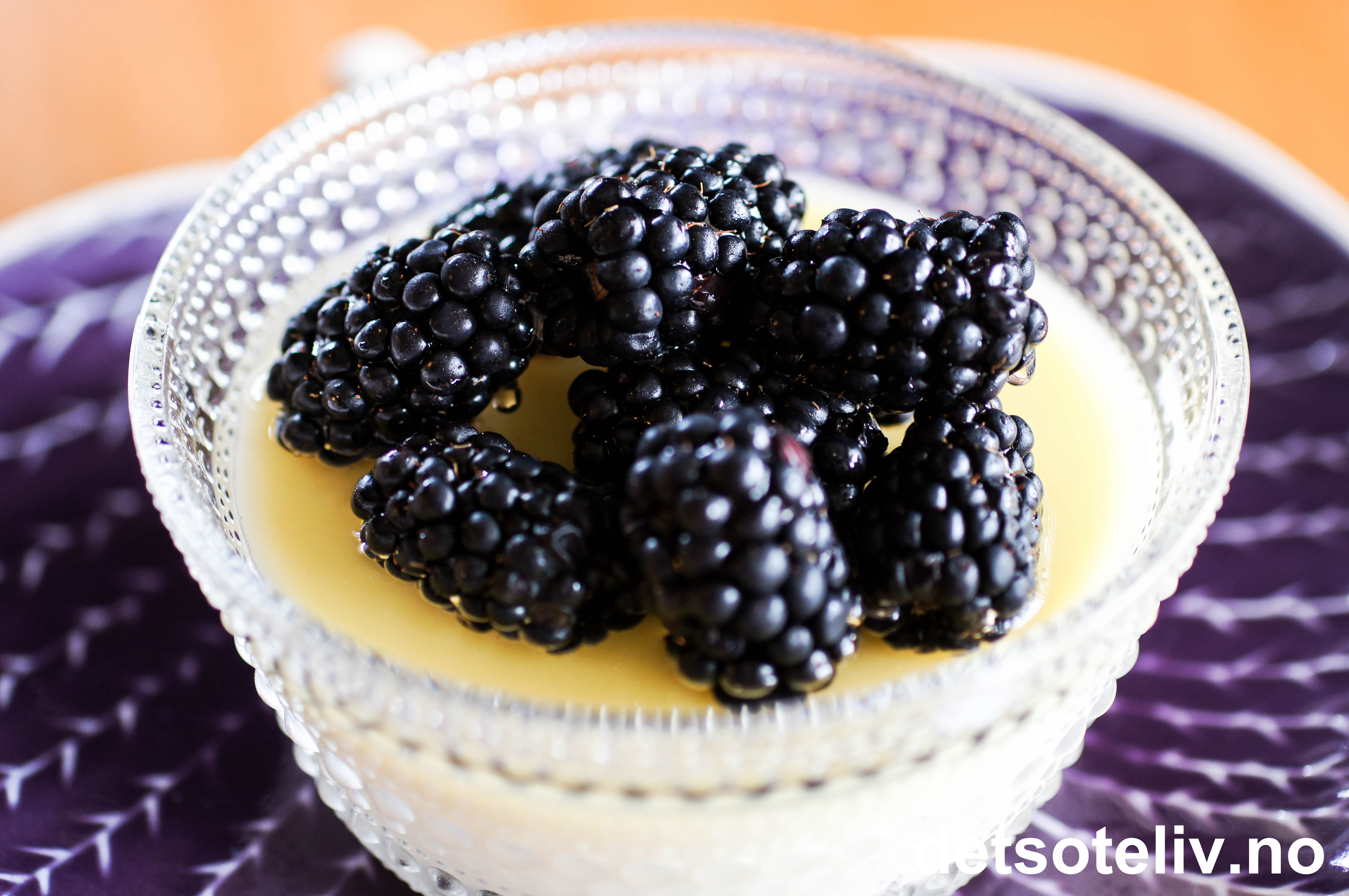 Jeg synes det blir penest med friske bjørnebær til denne desserten siden tinte bær avgir så mye saft. La gjerne bærene ligge og trekke i limesaften i et par timer før servering, så smaken trekker godt inn i bærene.