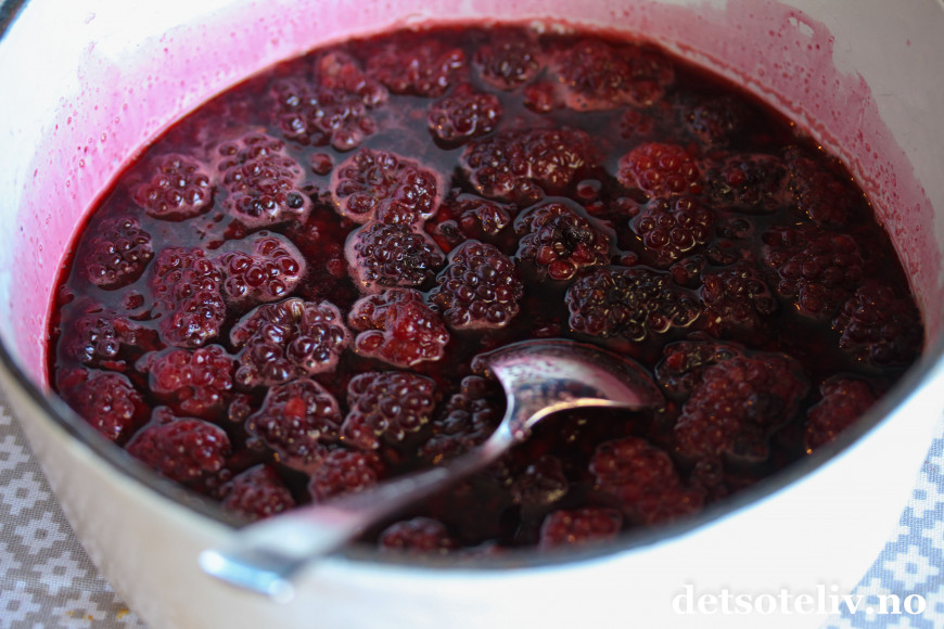 Denne gangen lagde jeg en nydelig bjørnebærcoulis ("coulis" er bare et fjongt navn på ulike typer hjemmelaget bærsaus ). Det går fint å bruke frosne bjørnebær som fås kjøpt hele året.