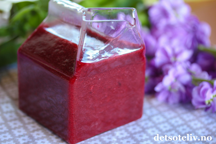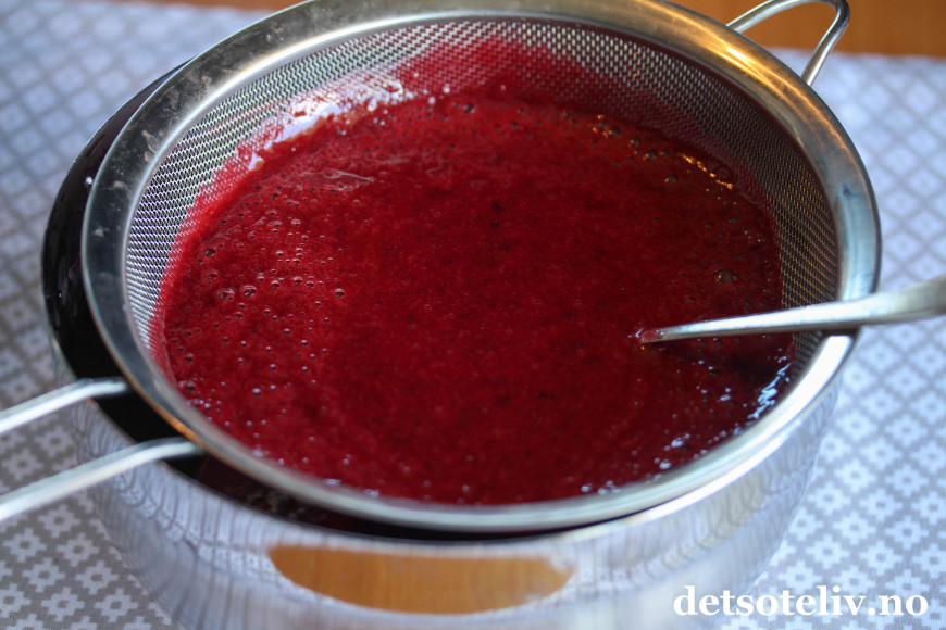 Press sausen igjennom en sil slik at du får fjernet alle frøene fra bærene (husk å skrape godt av på undersiden av silen også slik at all saft fra bærene kommer med).