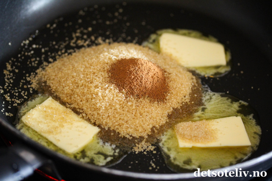 Ha brunt sukker, kanel og smør i en stekepanne.
