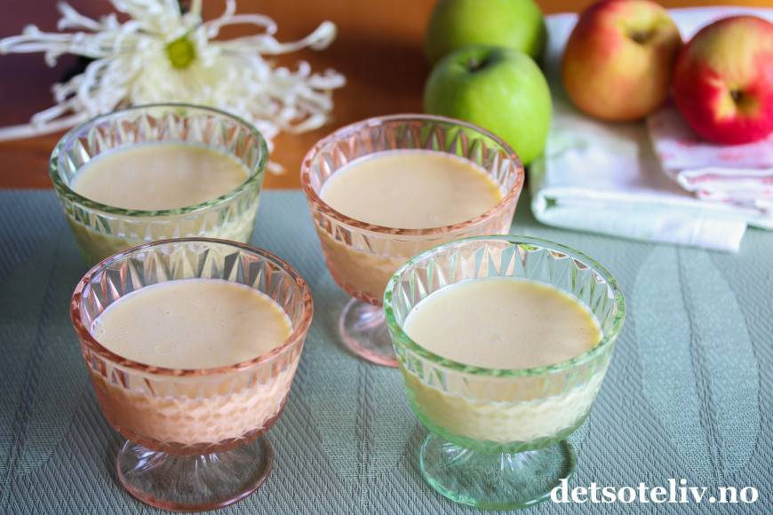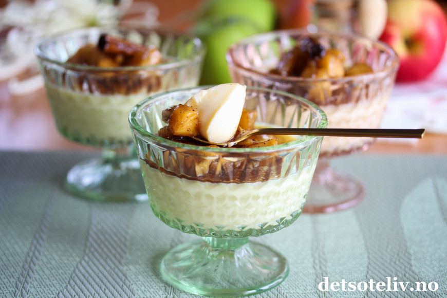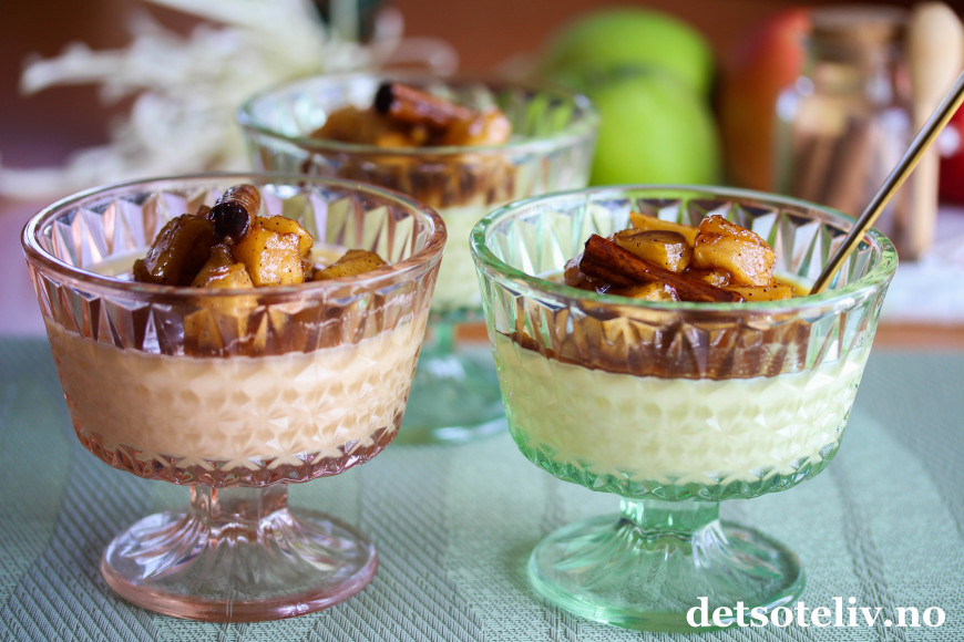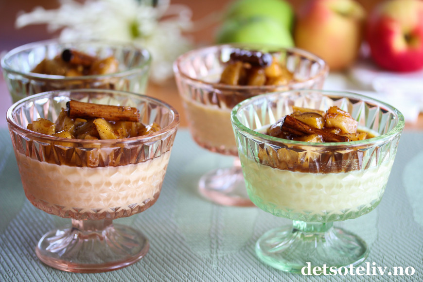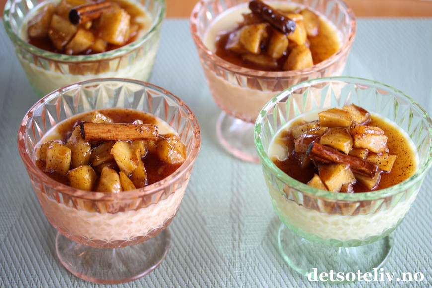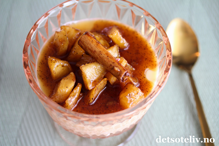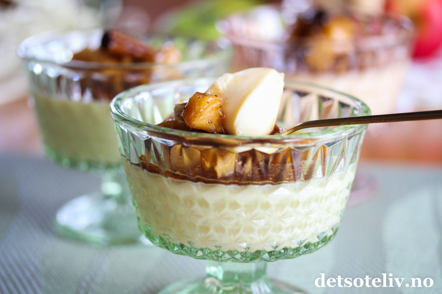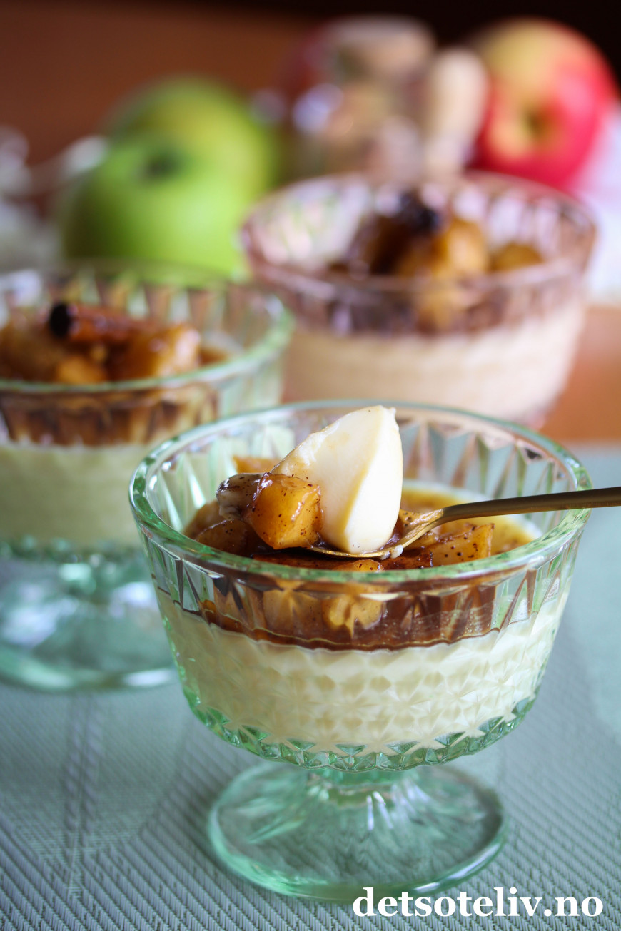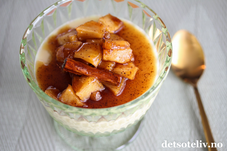 Panna cotta er en populær vaniljepudding som passer til det meste. Her har jeg toppet panna cottaen med eplebiter som jeg har varmet med brunt sukker og kanel.