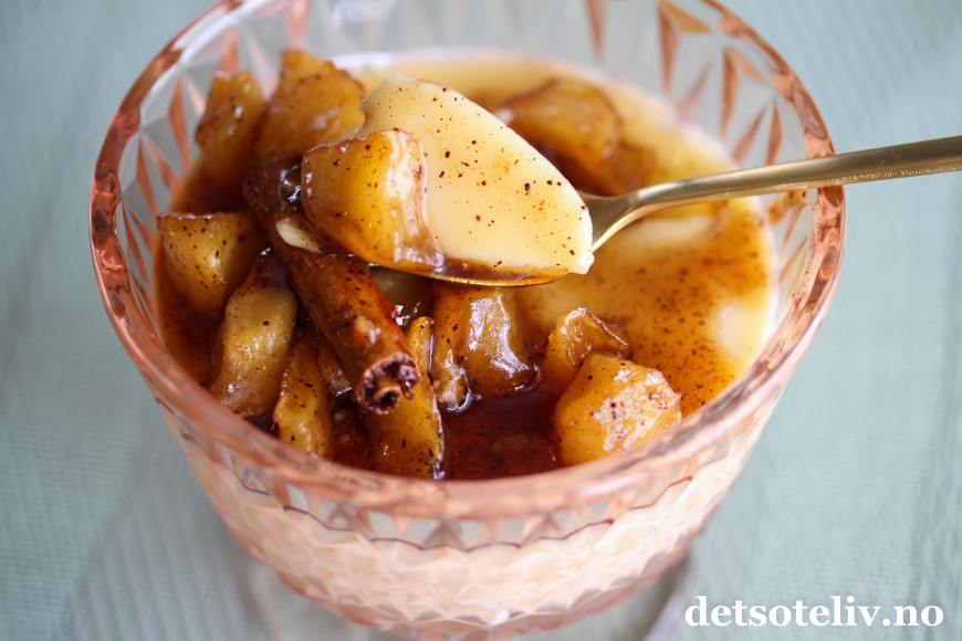 Du bestemmer selv om du vil avkjøle eplene litt først eller om du vil legge dem på panna cottaen varme. Jeg avkjølte eplene til de var smålunkne.