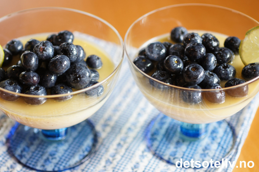 Minst en halvtime før servering legges blåbærene oppå panna cottaen. Bland presset limesaft og sukker og rør til sukkeret har løst seg opp. Øs dette så over blåbærene. La det hele stå i kjøleskapet i minst 30 min så limesmaken får satt seg litt i blåbærene.