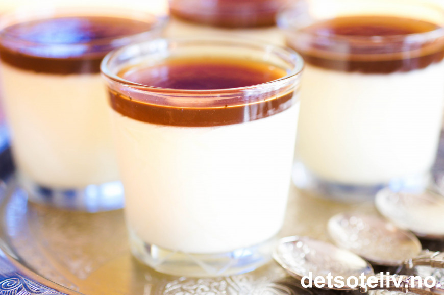 Panna cotta kan lages i utallige varianter og du finner flere forslag her på Det søte liv. Denne varianten smaker mildt av vanilje og sitron og dekkes med et tynt lag hjemmelaget madeiragelé. Jeg synes denne varianten av Panna cotta passer spesielt godt servert i små porsjoner etter litt tunge høst- og julemiddager.