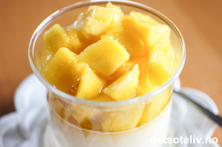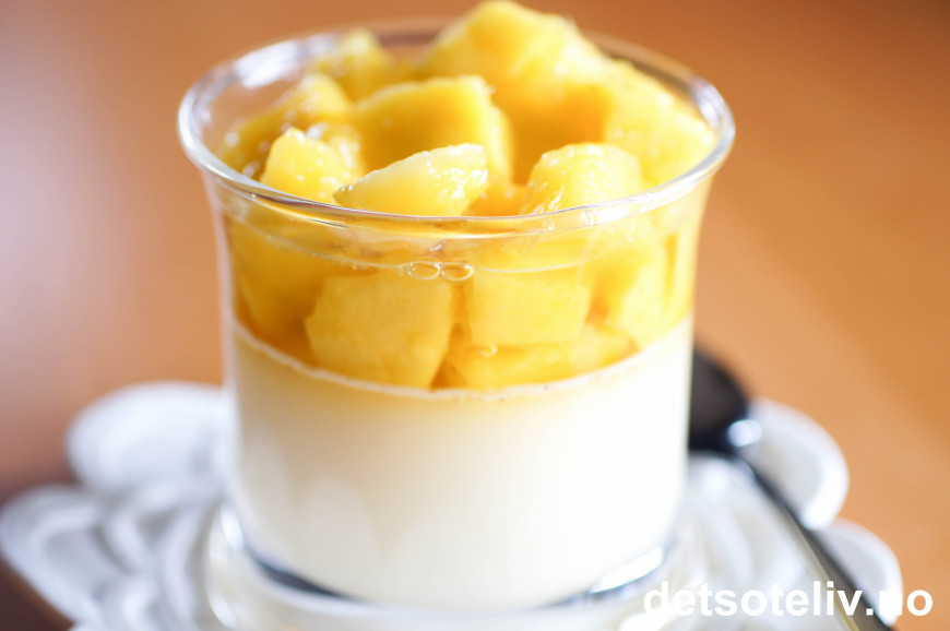Minst en time før servering legges renset mango oppdelt i biter oppå panna cottaen.