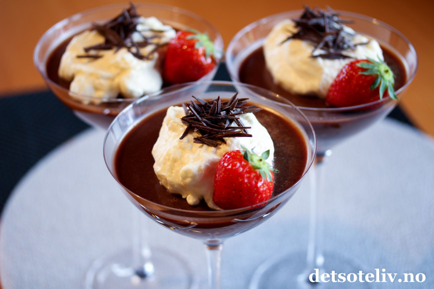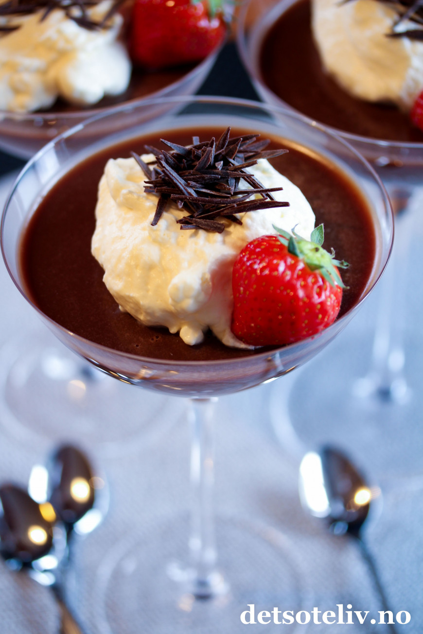 Fordel sjokoladefløten i 4 dessertskåler og sett dem i kjøleskapet over natten (eller i minst 4 timer) så panna cottaen stivner.