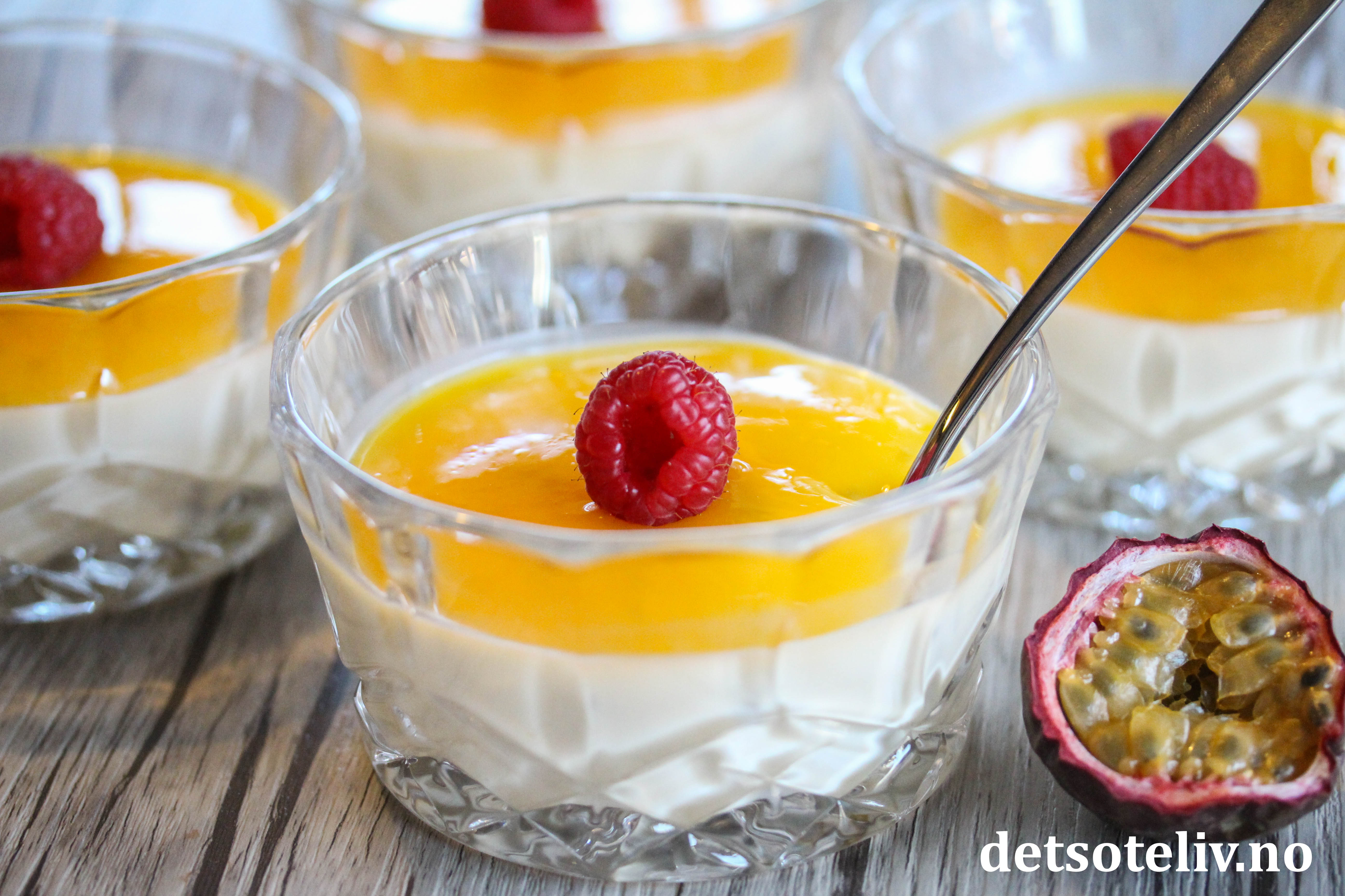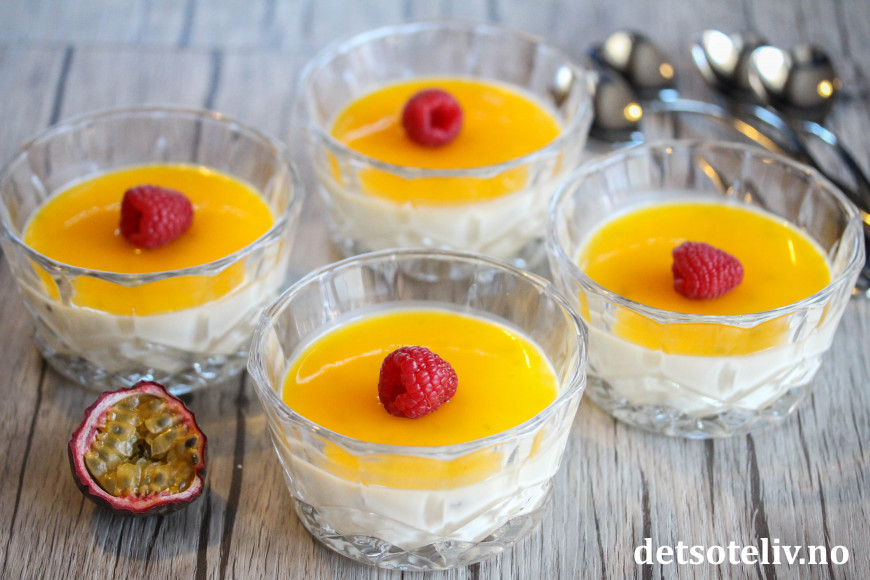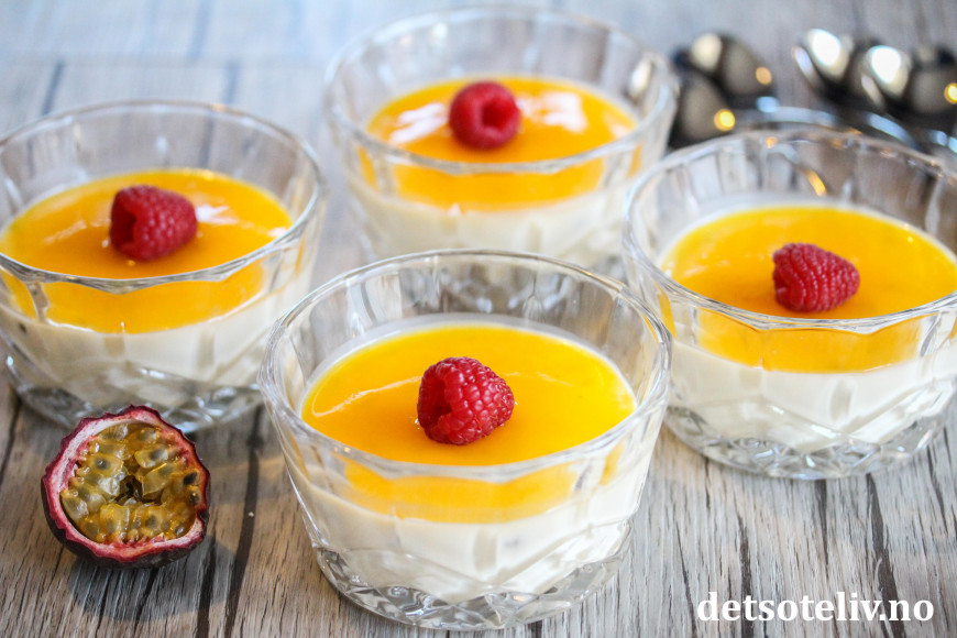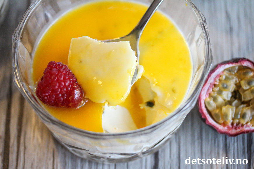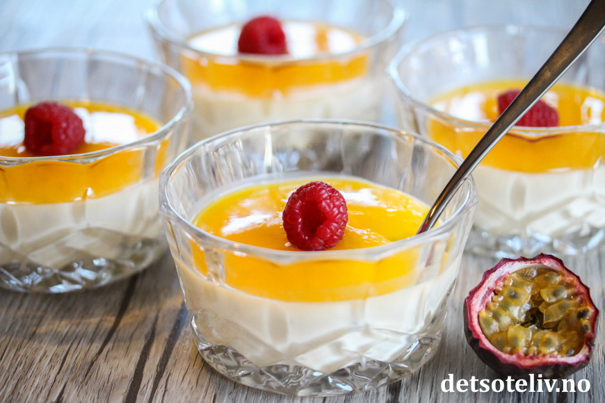 «Panna cotta» betyr «kokt fløte» på italiensk, og er en av verdens mest populære desserter. Her har panna cottaen fått frisk og eksotisk smak av pasjonsfrukt, som brukes både i selve puddingen og i sausen på toppen.