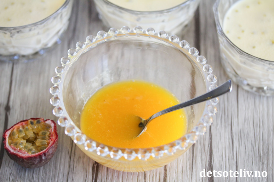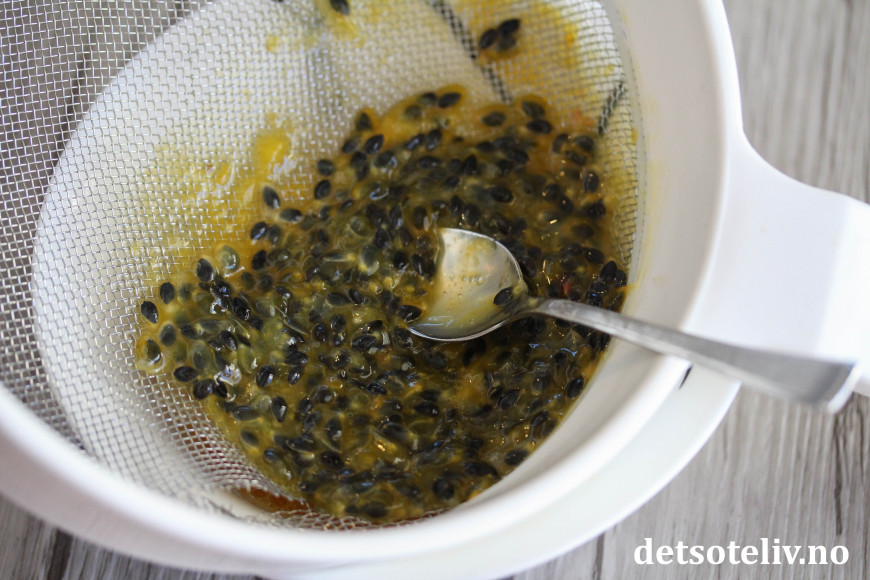 Lag pasjonsfruktsaus ved å dele 4 pasjonsfrukt på midten og skrap ut fruktkjøttet i en skål. Varm opp pasjonsfrukten i noen sekunder i mikroen og rør godt så du ser at fruktkjøttet begynner å slippe stenene. Sil blandingen.