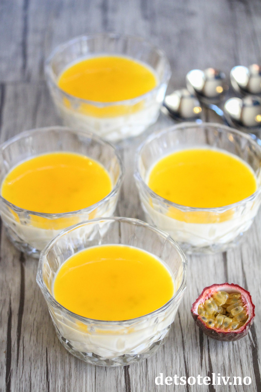 ♥ Se også oppskrift på Pasjonsfrukt-panna cotta som er uten pasjonsfrukt i selve panna cottaen, og hvor jeg har beholdt pasjonsfruktstenene i sausen. Denne versjonen her som er uten stener blir enda mer delikat!