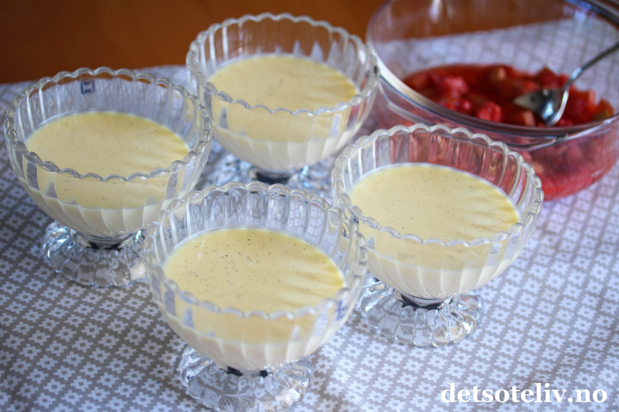 Fordel blandingen i 4-6 dessertskåler (jeg lagde 4 slik at det ble store porsjoner) og sett i kjøleskapet i noen timer (eller over natten) til panna cottaen har stivnet.