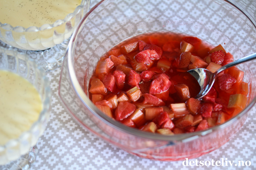 Sett formen midt i ovnen og la rabarbraen varmes ved 200°C i ca 15 minutter, til sukkeret smelter slik at du får en deilig dessertsirup og rabarbrabitene blir møre. Ta formen ut av ovnen og bland i jordbær som er delt opp i små biter. Rør rundt så jordbærene blander seg godt med sausen. Avkjøl sausen til den er helt kald.