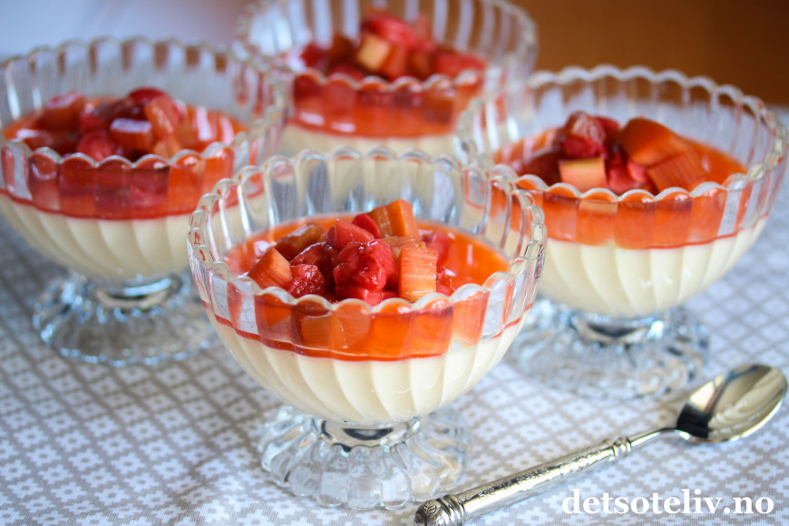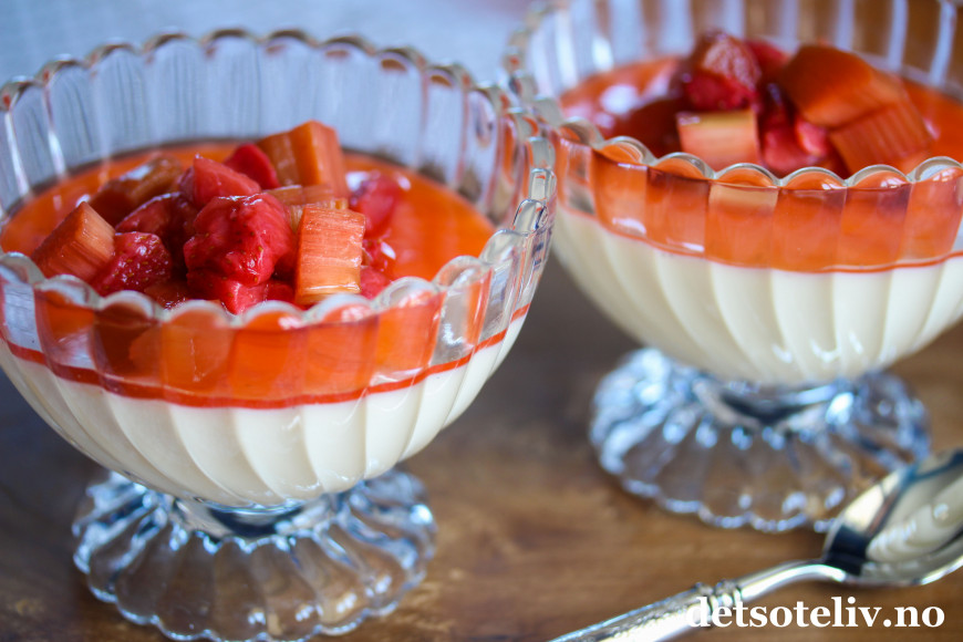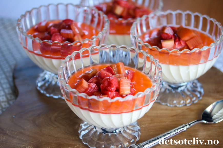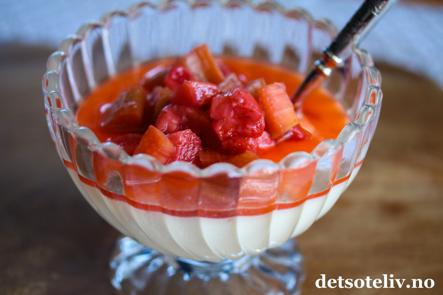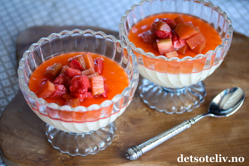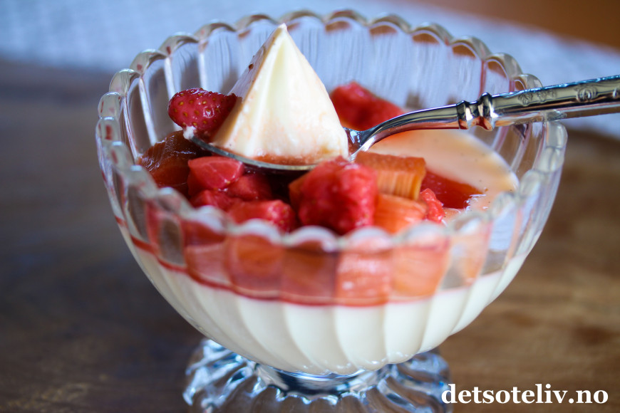 Panna cotta med ekte vanilje smaker fantastisk godt med en litt søt-syrlig dessertsaus laget med rabarbra og jordbær.