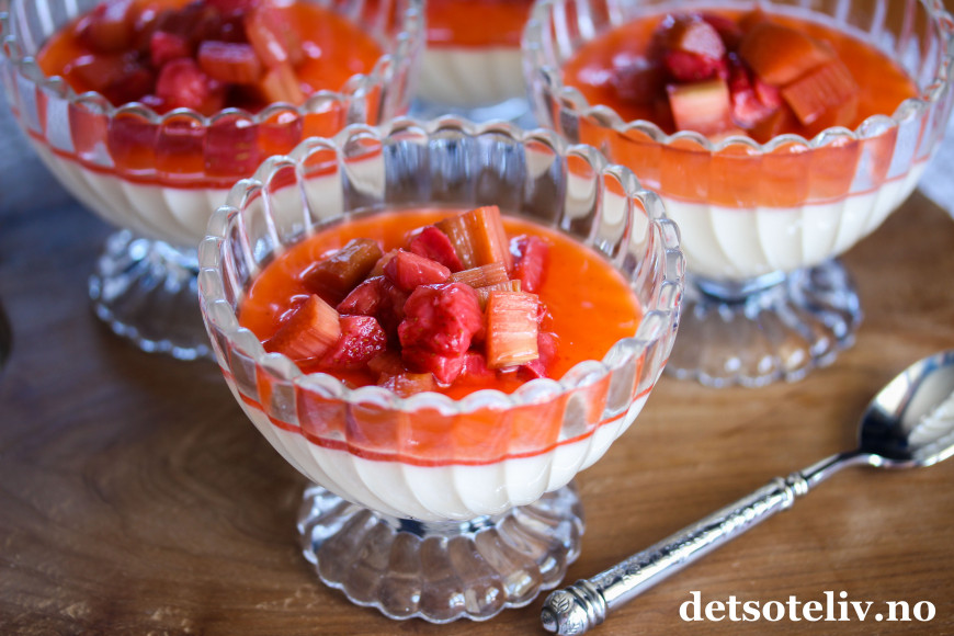 Fordel rabarbra- og jordbærsausen oppå panna cottaen før servering.