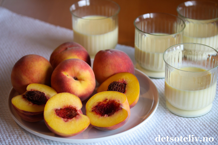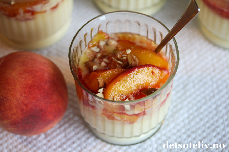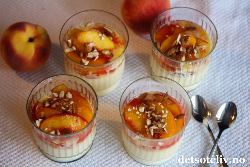 ♥ Siden jeg her har lagt ferskenene varme oppå panna cottaen, vil panna cottaen smelte litt. Derfor er det lurt å legge ferskenene på panna cottaen rett før servering.