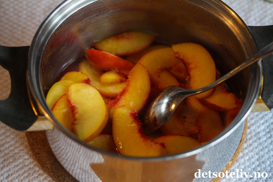 ♥ Bruk helst søte fersken for best smak, men de må ikke være for bløte, ellers går ferskenbåtene i oppløsning ved oppvarmingen.