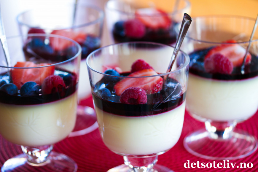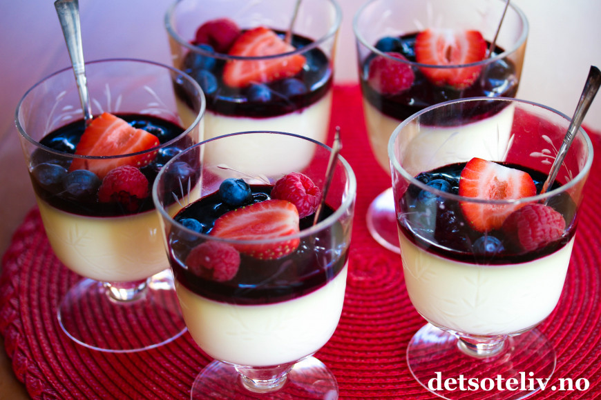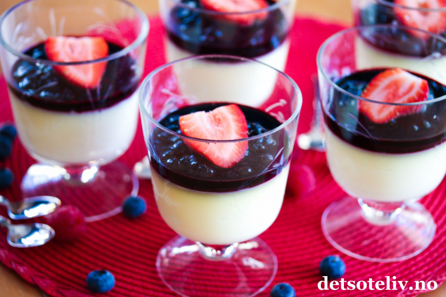 Du kan variere med å bytte ut blåbærsausen med jordbær- eller bringebærsaus, se for eksempel Panna cotta med jordbærcoulis og Panna cotta med hvit sjokolade og rørte bringebær.
