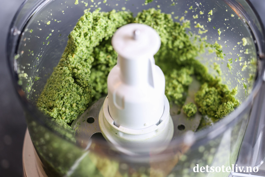 Tilsett basilikum, pinjekjerner og presset hvitløk og kjør dette sammen til en kornete masse.