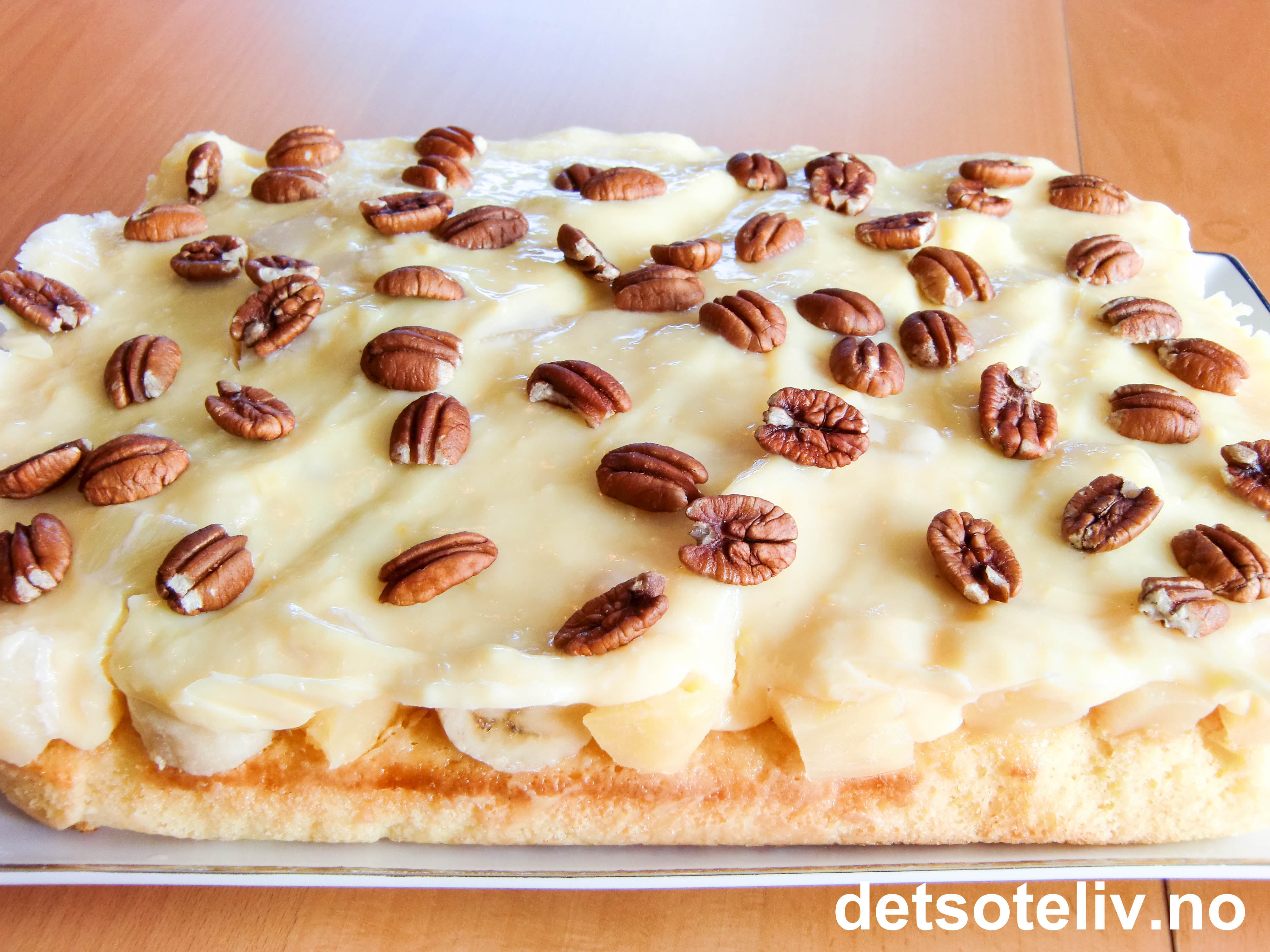 Dynk kaken godt med saft fra ananasen. Knus ananasen lett og fordel over kaken. Ha over bananskiver.