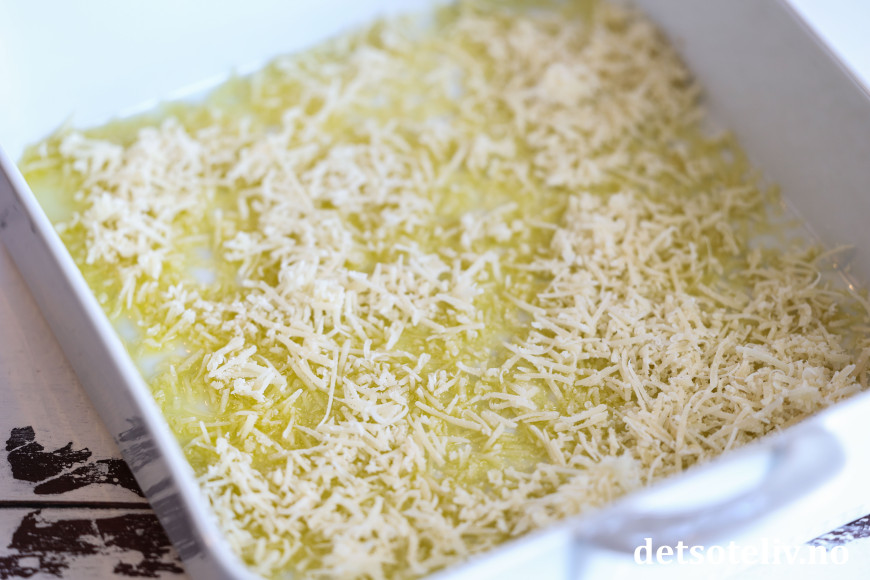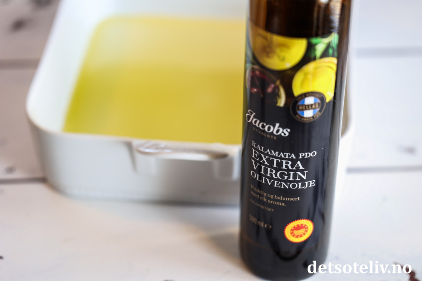 Finn frem en ildfast form (min måler ca. 22 x 22 cm). Hell olivenolje eller smeltet smør i formen.