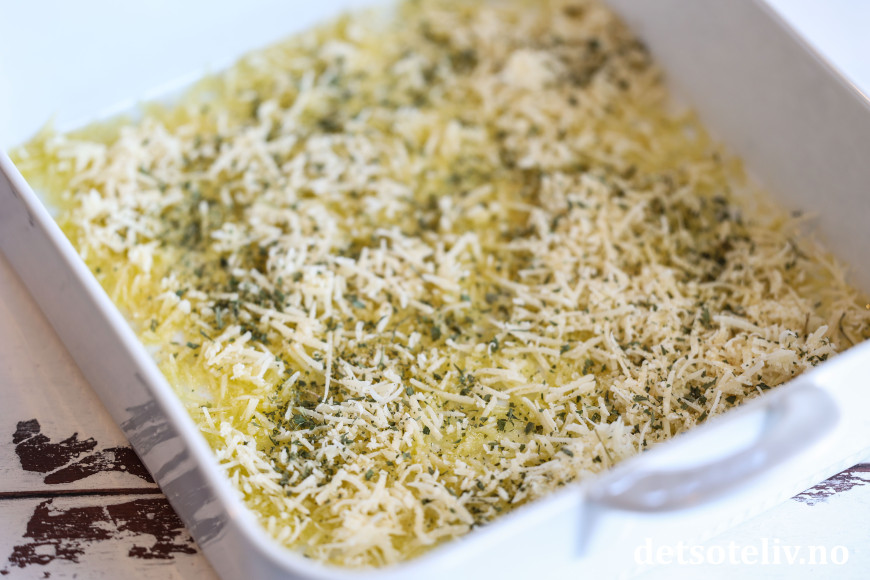 Riv parmesanosten og fordel mesteparten i formen. Dryss over hvitløkspulver, salt og tørket gressløk eller persille.
